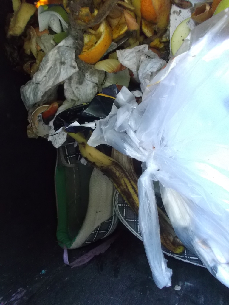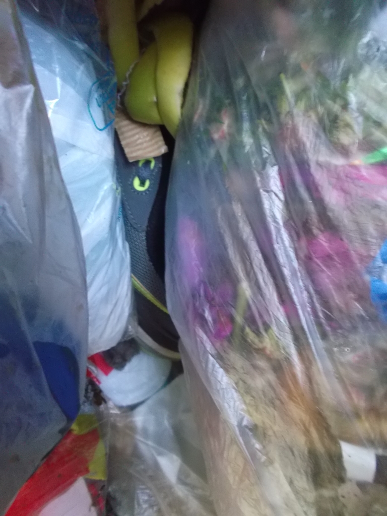 In dieser Siedlung werden die Container jeweils am Freitag geleert, also wollte ich mal prüfen, ob sich schon was finden lässt bei halber Neubefüllung nach 31/2 Tagen: Leider nur Pleiten und wenn endlich mal etwas Textiles gefunden wurde, dann waren es Männerlumpen, pfui.