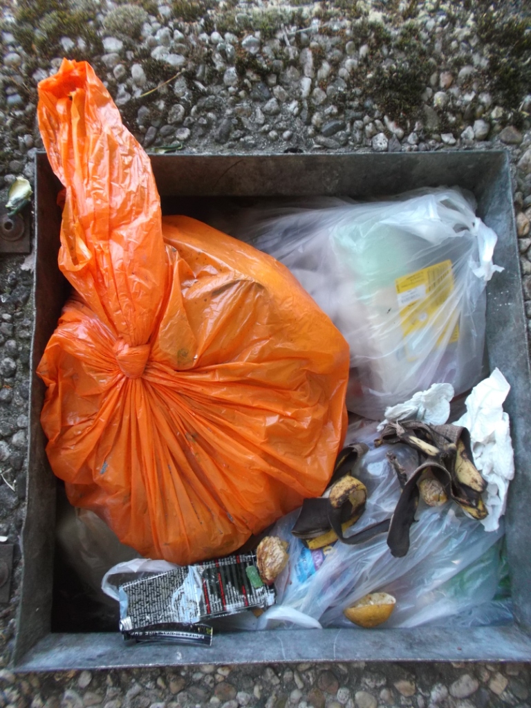 Auch eine schöne Kombination, der Altkleidersack und der Müllsack: Während der Inhalt des einen verwertet wird, gibt’s für den anderen nur den Weg ins Feuer. Als passionierter Sammler weiss ich natürlich, dass sich die Mädels oft schämen, ihre verwaschenen und löcherigen Höschen und die ausgeleierten Bh’s in den Altkleidersack zu geben und darum werden diese Dinge in den Abfallsack gestopft, damit niemand mehr sie zu Gesicht bekommen wird.