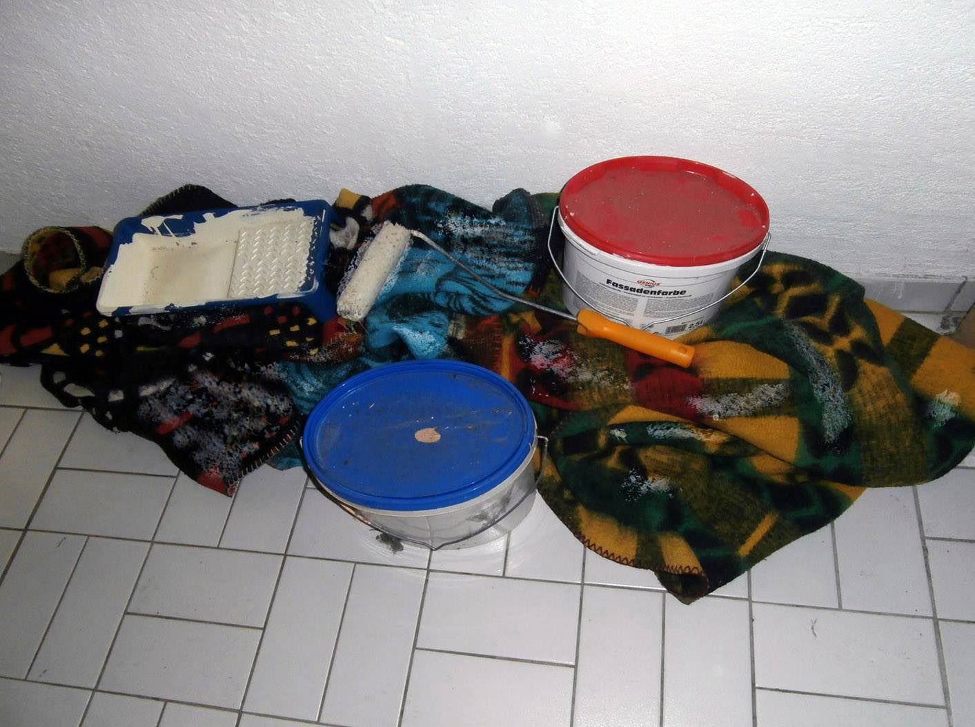 Da ich momentan die Woche über im Ausland tätig bin, bekomme ich das leider nicht mit. Die schönen Decken hatte er zum Renovieren seines Wohnzimmer gebraucht um Möbel damit abzudecken und den Pinsel auszuwaschen.