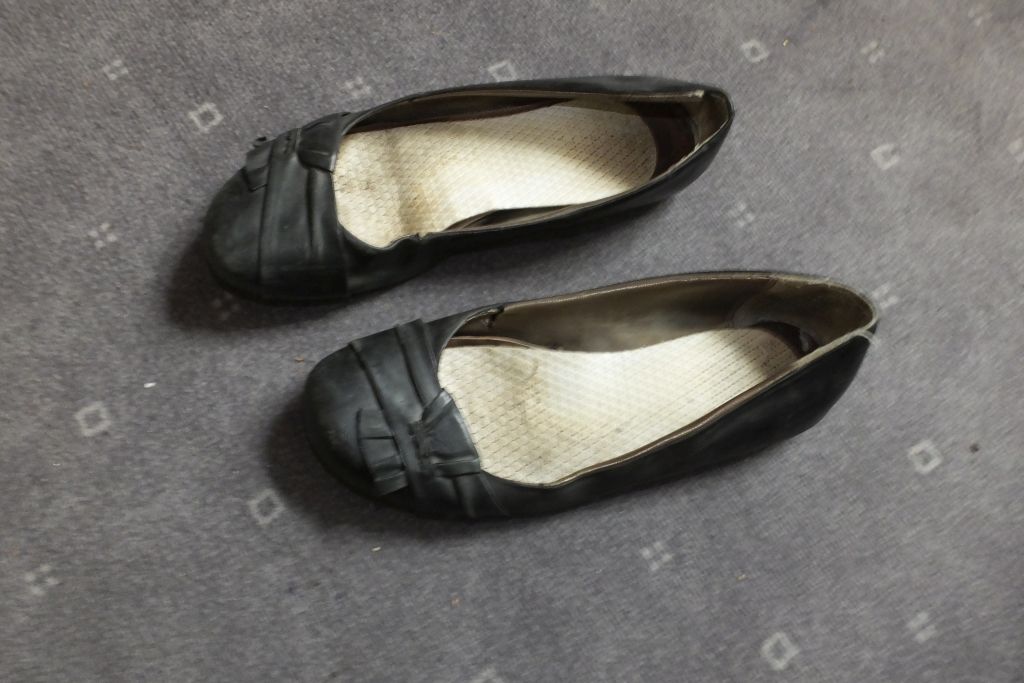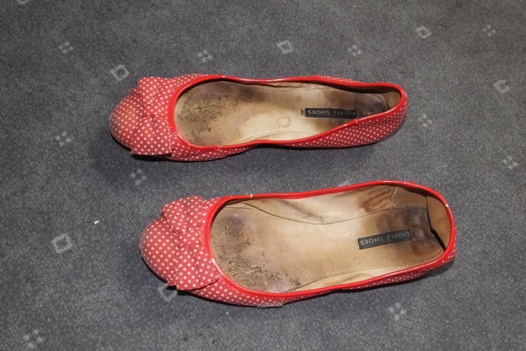 die roten ballerinas sind ja heftig zerlatscht, die müssen ja richtig käsig riechen