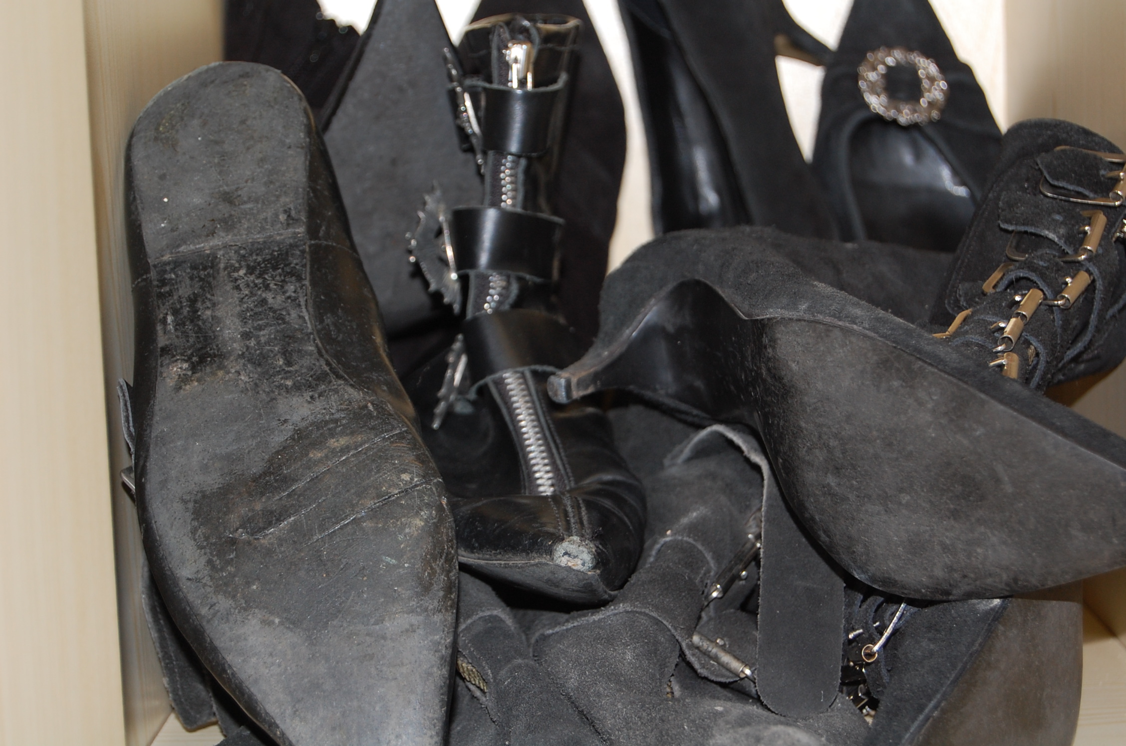 Die eleganten Schnallenpumps sehen noch richtig gut aus. Im Nebenfach die schwarzen weichen Wildlederstiefel neben dem weißen Paar: Supergeil und allemal ein Grund, sich um deren Entsorgung - wenn unbedingt nötig - schon jetzt zu bewerben; herrlich dünngelaufene Sohlen.