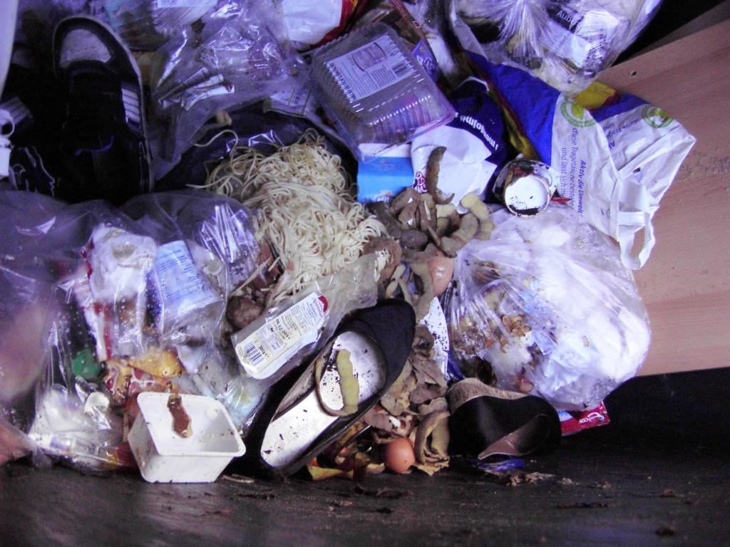 - typischer Studentenchaos: Lumpen, Schuhe, Fastfood-Schachteln, Papier und Pappe und kleiner Sperrmüll. Hier wird halt eher weniger gekocht, daher kaum Küchenabfälle aber dennoch Essensreste.