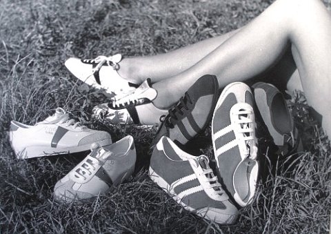 Um 1920 beginnen Rudolf und Adolf Dassler in der Waschküche ihrer Mutter Turnschuhe herzustellen. Sie fertigen aus Leinen und drei Lederstreifen einen Trainingsschuh für Läufer. Es ist der erste Sportschuh, der zum Ausdruck einer Anti-Establishment-Haltung wird und außerhalb von Sportstadien Karriere macht. Adi Dassler trägt die drei Streifen als Warenzeichen ein und eine Marke wird geboren. 1948 trennen sich die beiden Brüder: Rudolf Dassler gründet die Firma "Puma", Adi Dassler "Adidas". 1954 wird Deutschland in Adidas-Fußballschuhen mit auswechselbaren Schraubstollen Weltmeister. Beide Firmen dominieren weltweit über einen langen Zeitraum gemeinsam den Sportschuhmarkt.