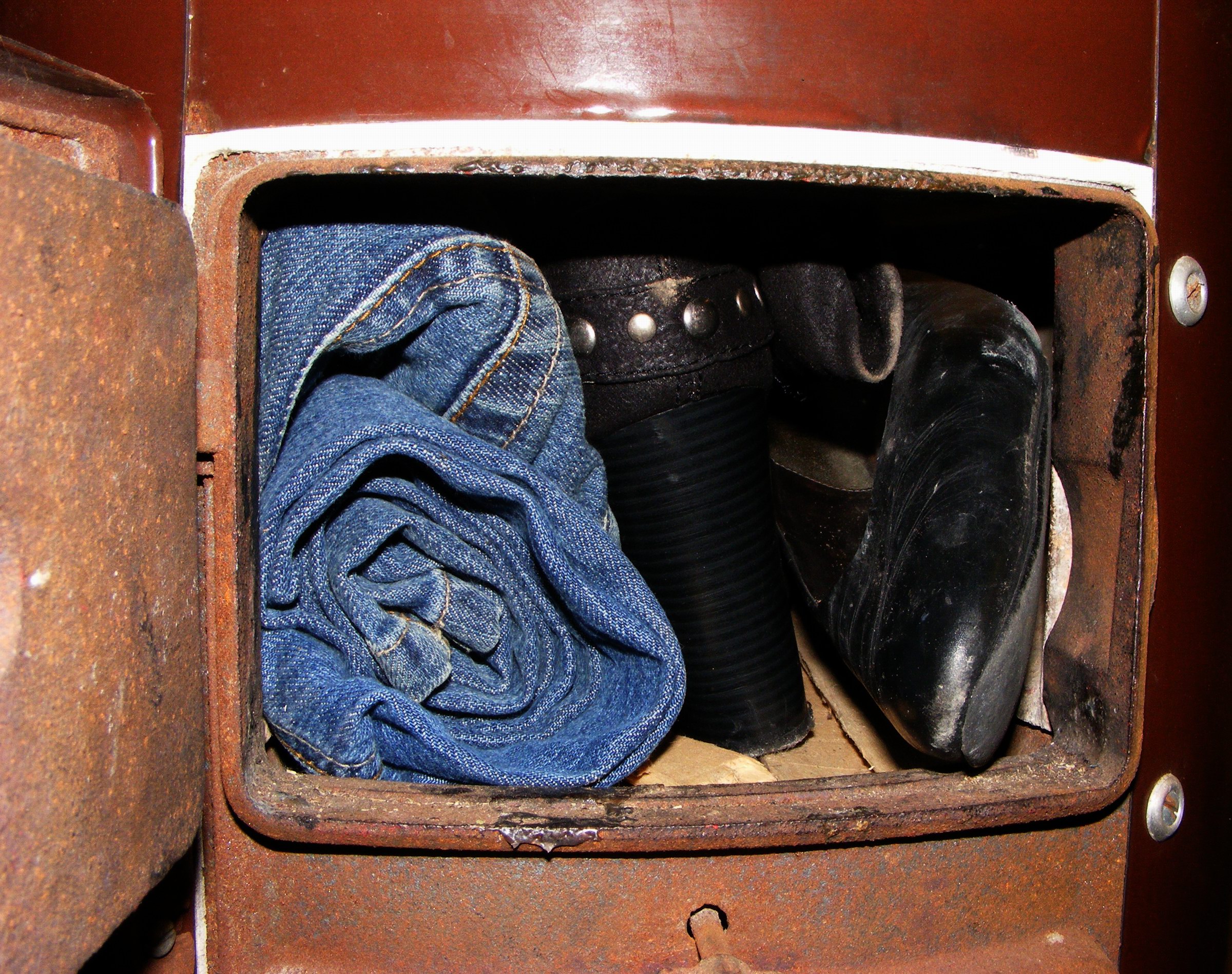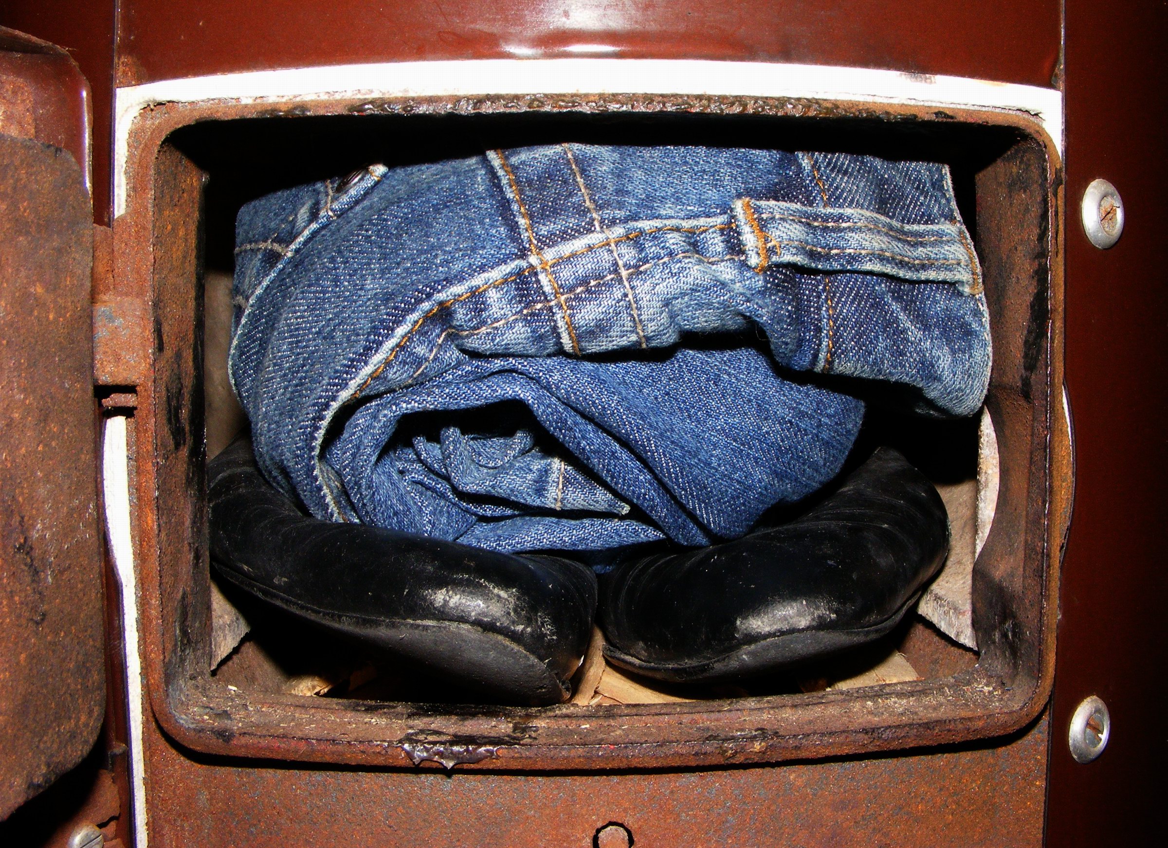 Zweckmäßigerweise müßten die Windeln zu ihrer optimalen Verbrennung mit energetisch hochwertigeren Brennstoffen kombiniert im Badofen platziert werden, wie z.B. der weiße Stiefel (letztes Bild) oder die Jeans-/Lederhosen.