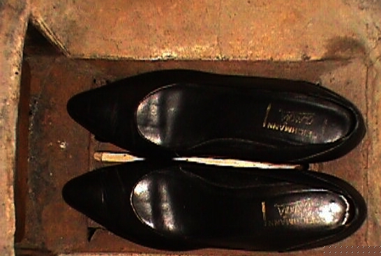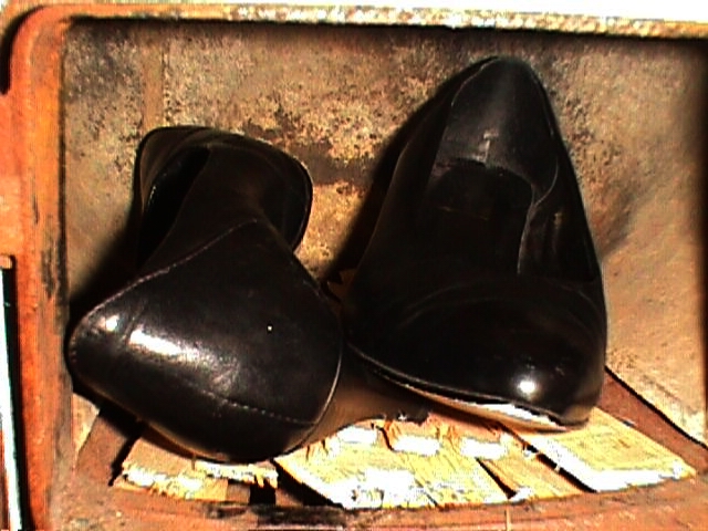 Lediglich drei Paar Leder-Schuhe in Größe 39 legte ich vorsichtshalber beiseite, bei denen eventuell die Gefahr bestand, daß sich meine helle Hose, wie auf diesem bekannten Bild, ein Wenig farblich verändern könnte, zumal auch mein Mann als "Hilfskoch" anwesend war.