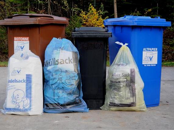 Mülltonnen und -container, Müllschlucker, Sperrmüll, Müllabfuhr, Müllpressen, Müllkippen, Müllverbrennung, Altkleidersammlung und Verschrottung.