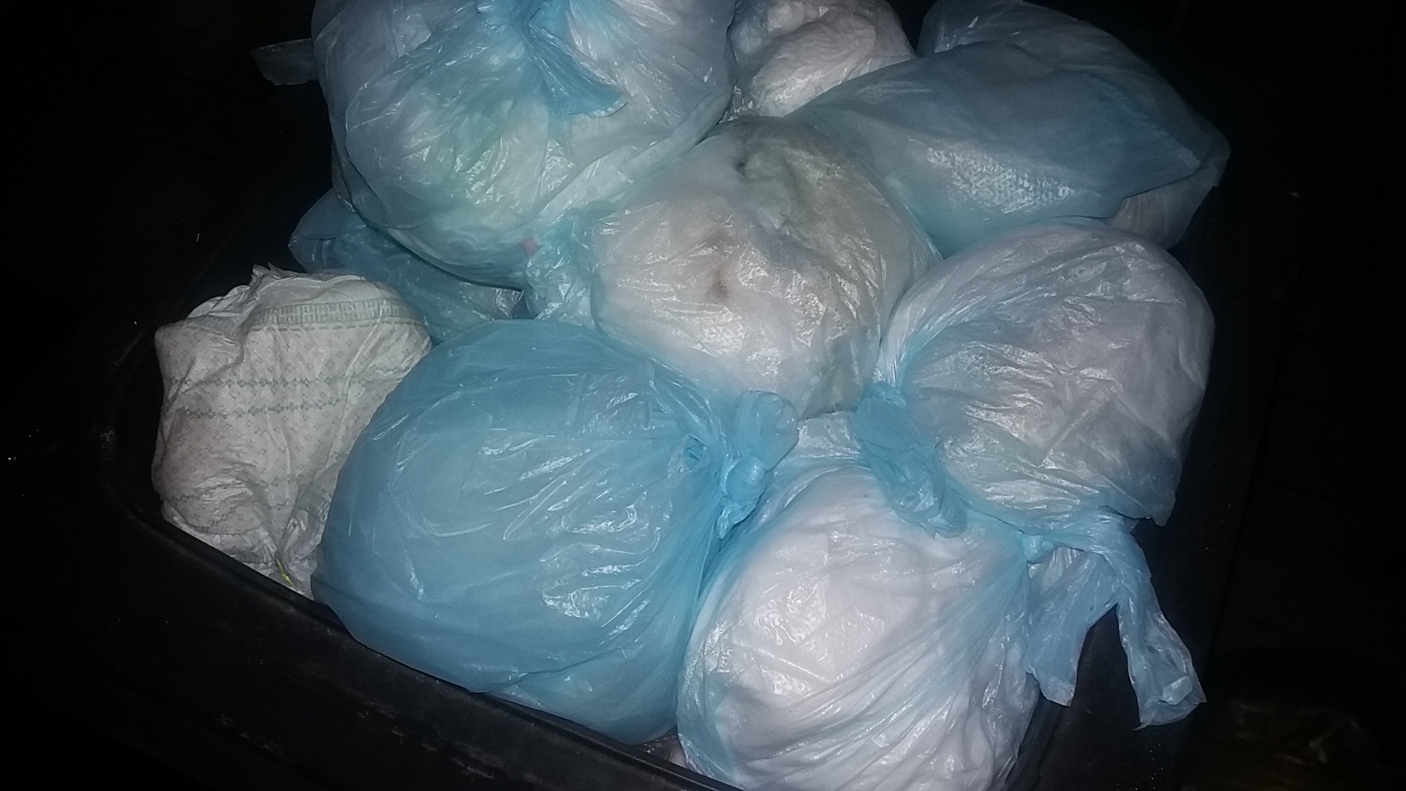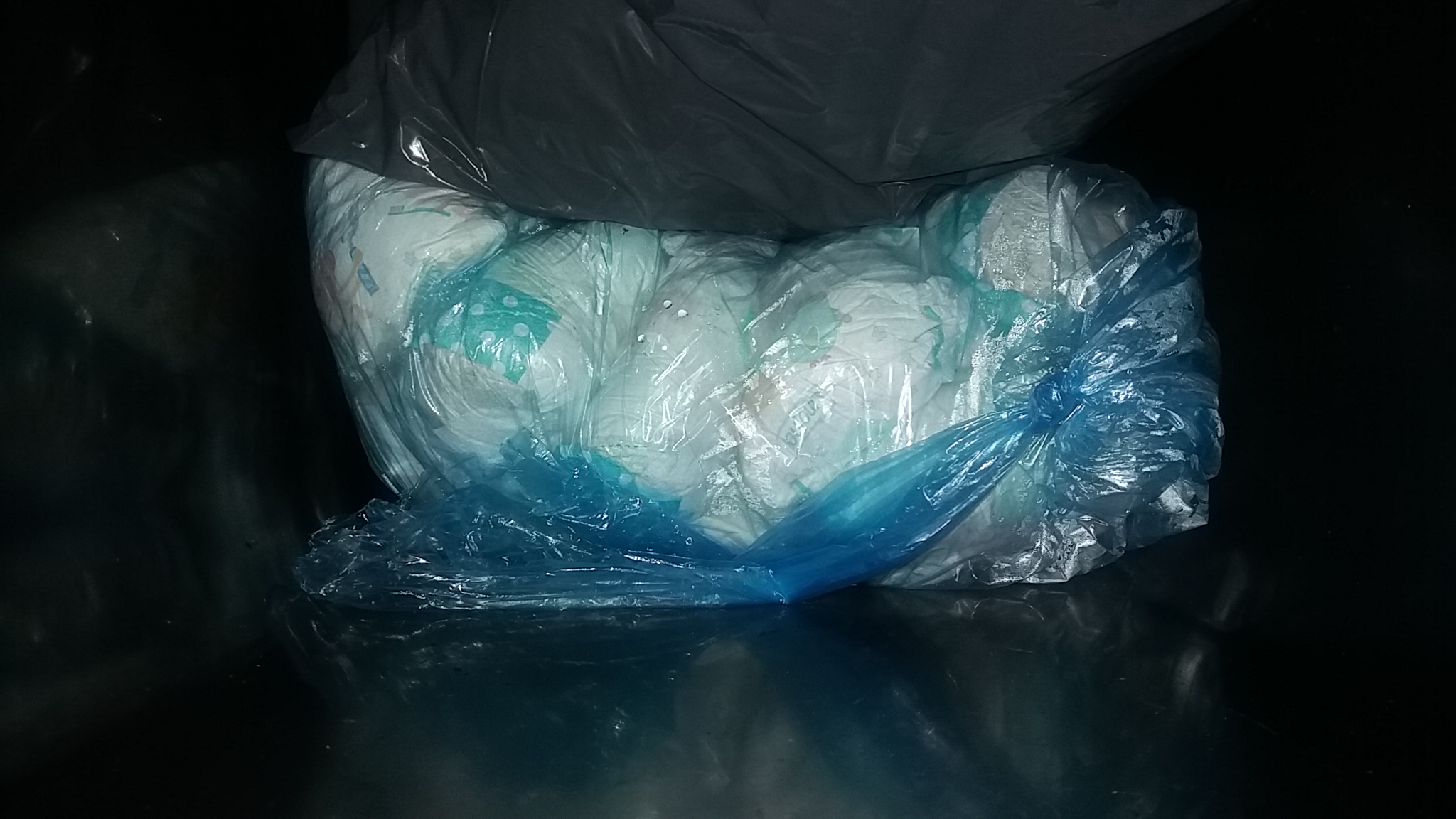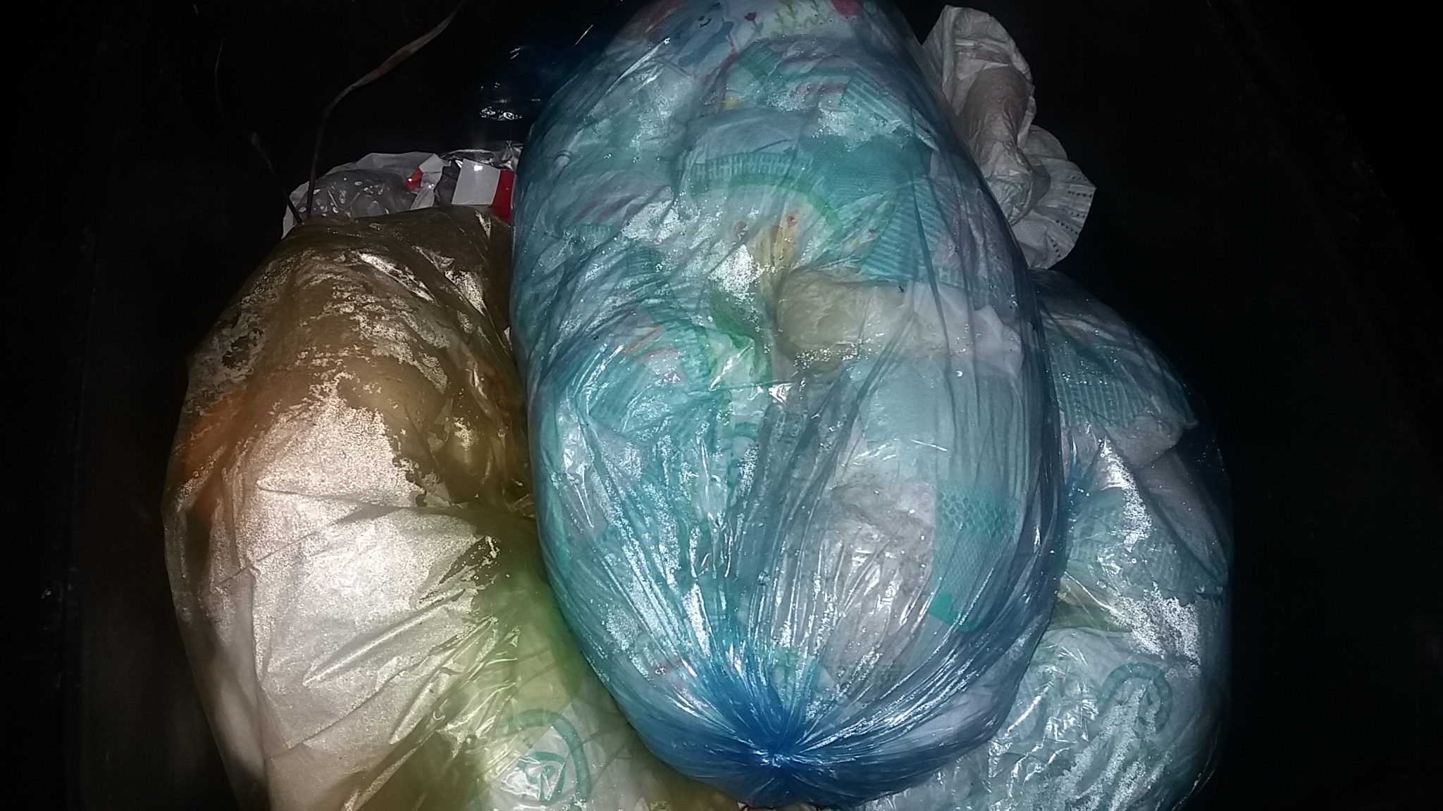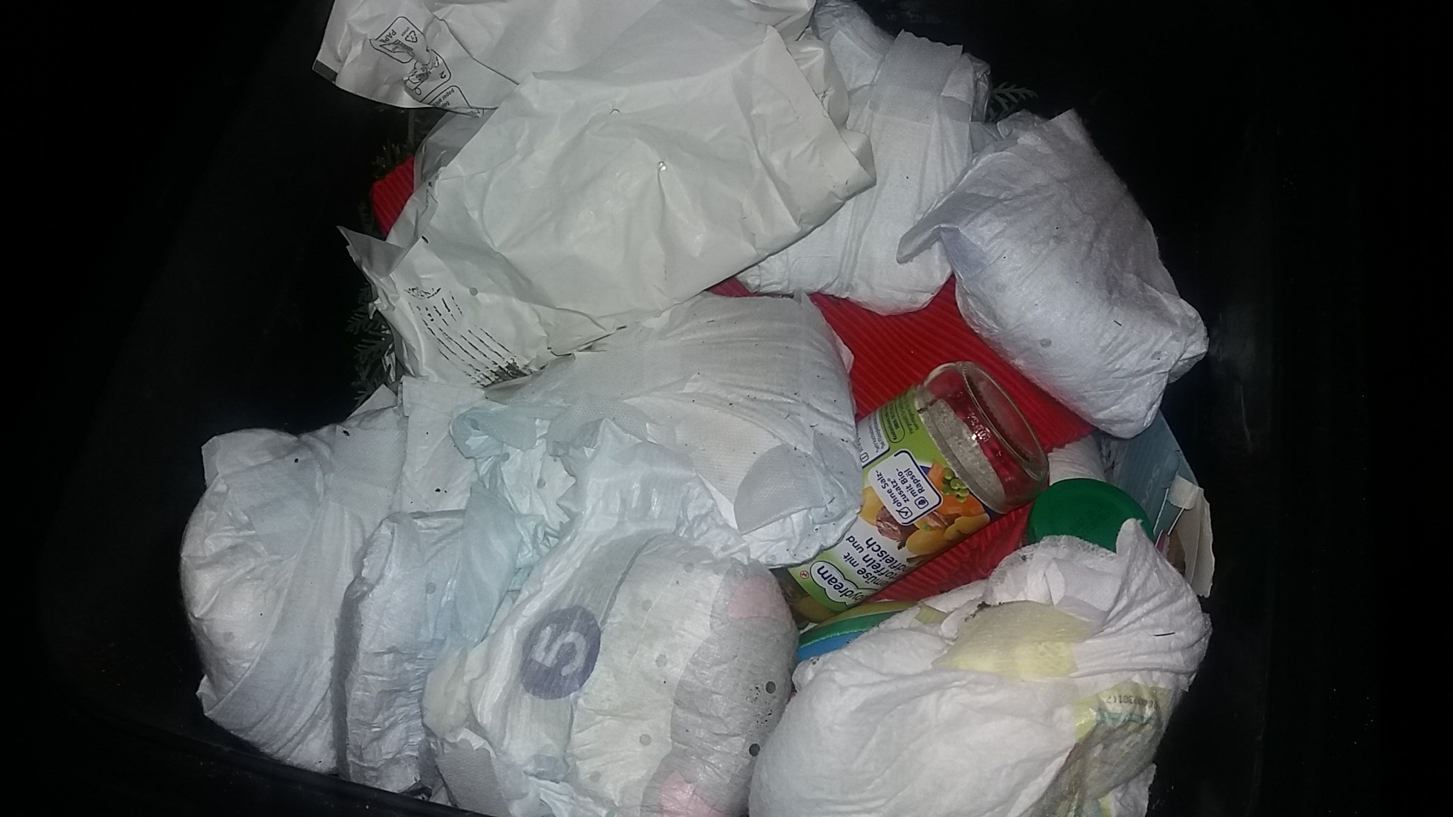 Wir haben unseren Müll in der Küche, ein 17l Sack in den alles reinkommt. Alle Windeln kommen auf den Balkon in einen anderen Sack. Nach einer Woche ist der Müll in der Küche 3/4 voll. Essensreste, Verpackungen, Dosen, viel Kunststoff. Manchmal so wie heute liegen noch Jeans, Shirt oder Schuhe drin. Ich nehme den Abfall und quetsche nun die Wochensammlung Windeln rein.