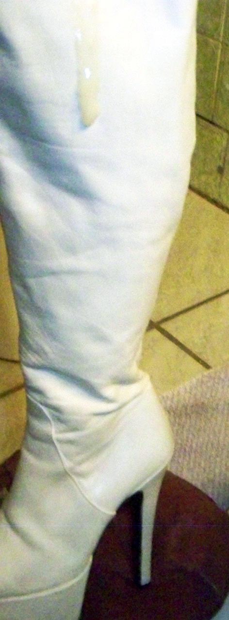 Ich legte die Schenkel auf seine Schultern und zog mit den Fingern den Slip beiseite. Ich spürte seine wie wild arbeitende Zunge ..., dann ließ ich mich nach Hinten auf den Tisch fallen. Er griff meine Fesseln, nahm die Beine von seinen Schultern, zog mich bis zu den Kniekehlen an die Tischkante und preßte meine Füße gegen seinen "Kumpel". Mit seitlich ausgestreckten Armen ließ ich es geschehen; ich rammelte auf der Tischplatte vor und zurück. Plötzlich hörten die ruckartigen Bewegungen auf, ich mekte, wie er die Stiefel mit den Fingern fest an den Spitzen faßte, ein nahezu nicht enden wollender "Strahl" matschte Schäfte und Spitzen voll.
