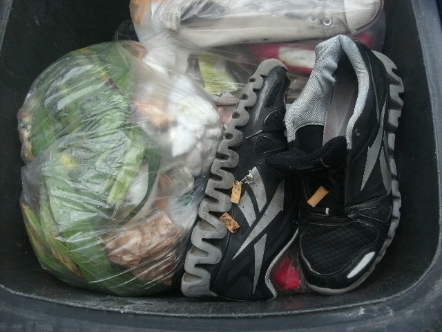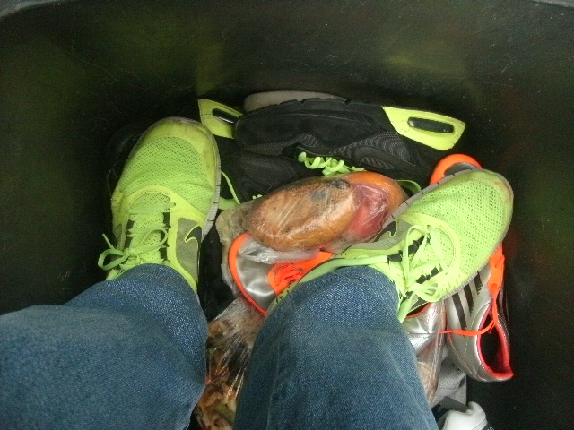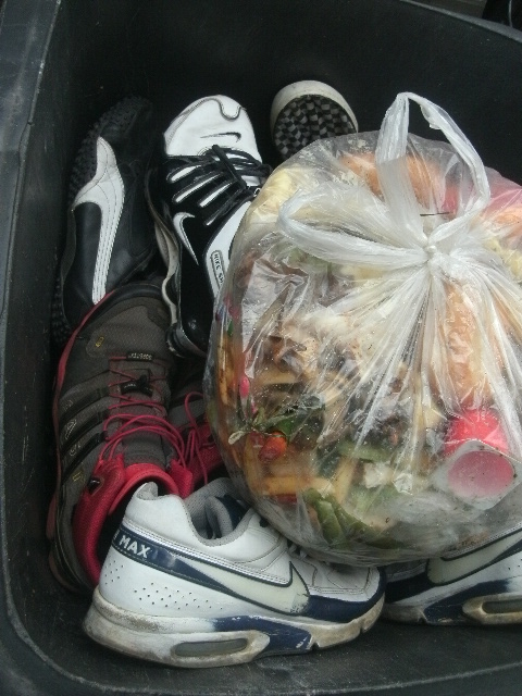 vorgestern kamen richtig geil duftende Asics in unsere Restmülltonne - auch von John. Und Laura warf noch ihr verschmähtes Pausenbrötchen drauf. :oops