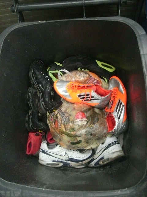 Die Asics lagen nun noch ziemlich tief im Dreck, obwohl sie doch die "letzten" waren, die diesmal in unsere Mülltonne kommen.