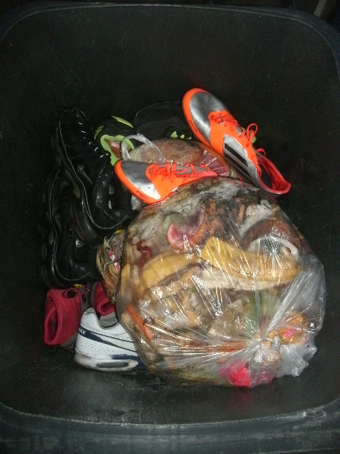 Nachdem alle Schuhe endlich in der Mülltonne lagen, kam auch der Küchenmüllbeutel oben drauf; - endlich alles weggeschmissen.