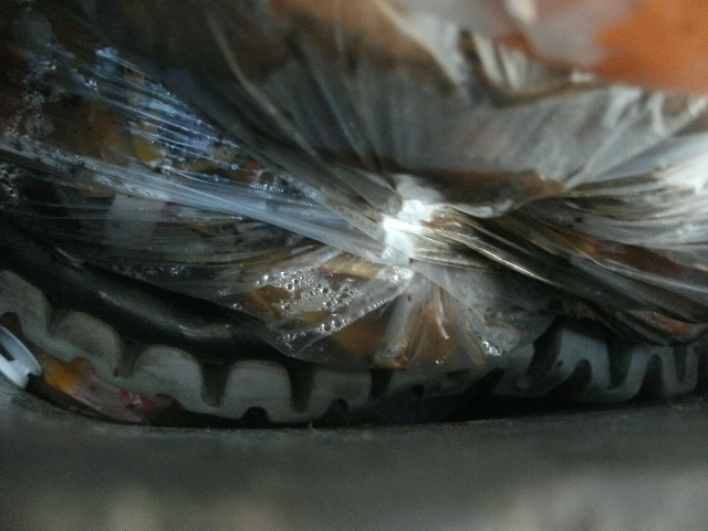 Der rosa Inhalt war ein aufgeplatztes Kopfkissen von Anja, das prima die Müllbrühe aufgesogen hat. ;)