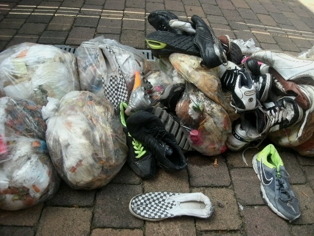 Sneaker, deren Schicksal zuerst noch nicht sicher war, mussten dann doch in den Müll und "bereicherten" unser "Müllkaleidoskop". Schön bunt war es allemal!