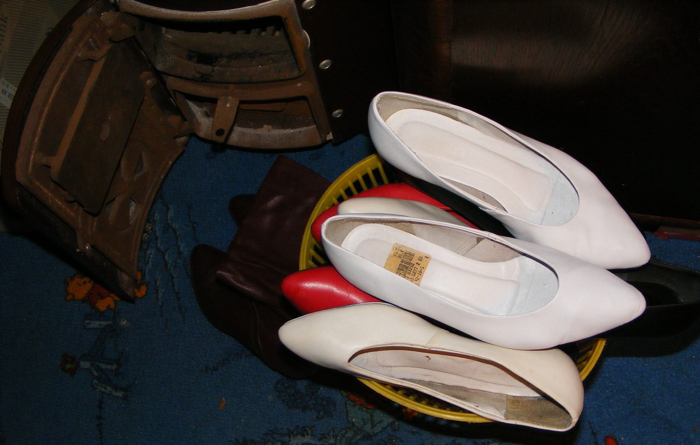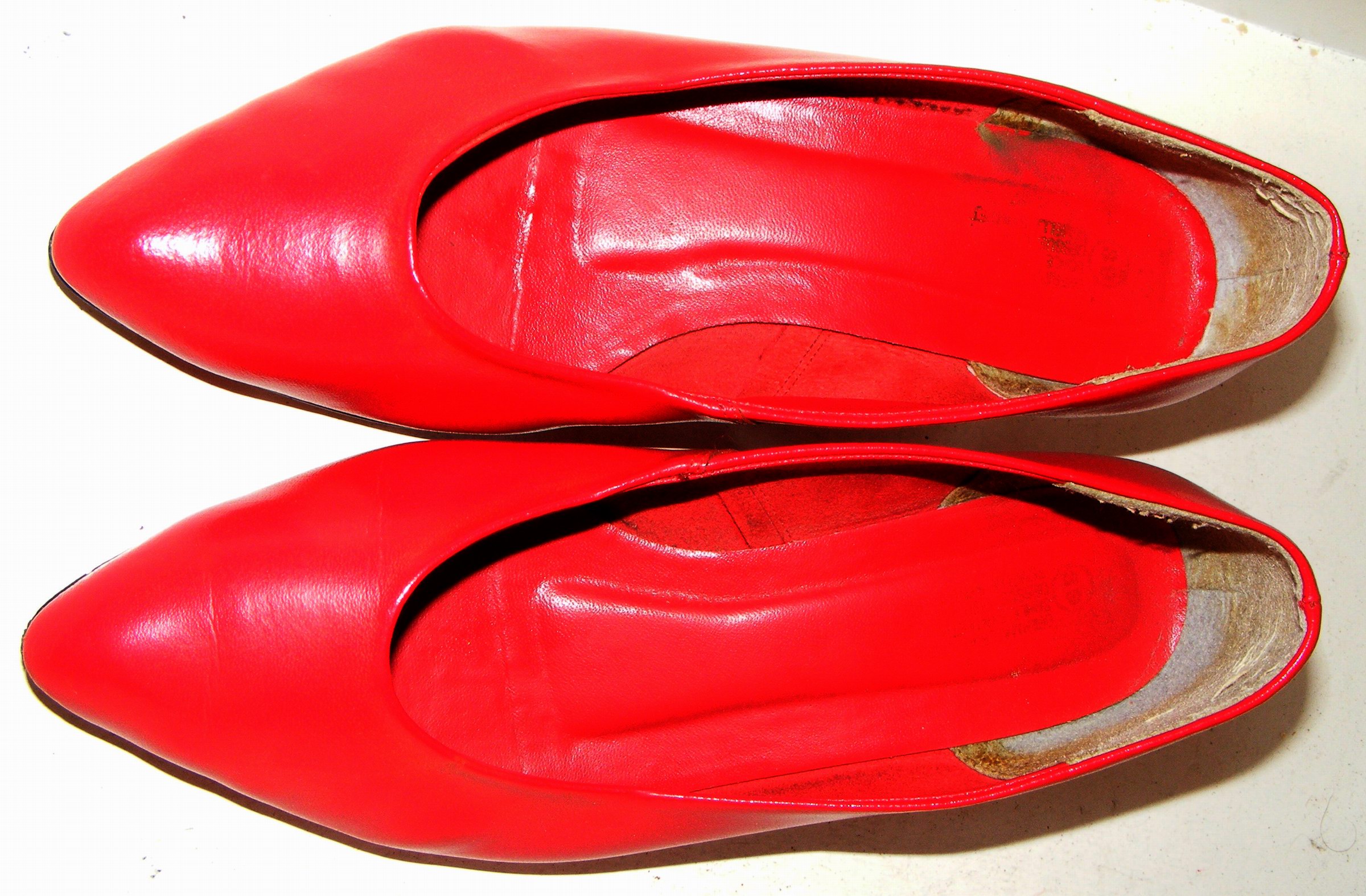 Anbei noch ein Paar, von einer damals mir gut bekannten 18jährigen Schuhverkäuferin einige Jahre bei der Arbeit (nur "indoor" auf Teppichboden) getragenen und im Sep. 1998 in die Altschuhkiste geworfenen (echt) Reno-Pumps. Sie selbst war in der Regel für die Beheizung des Laden-Ofens "zuständig", nur mein gelegentlicher Besuch und der warme Spätsommer rettete den Schuhen, die am Fuß der "Heizerin" mit Sicherheit schon viele ihre "Leidensgenossinnen" haben Brennen sehen, ganz knapp ihr Leben!