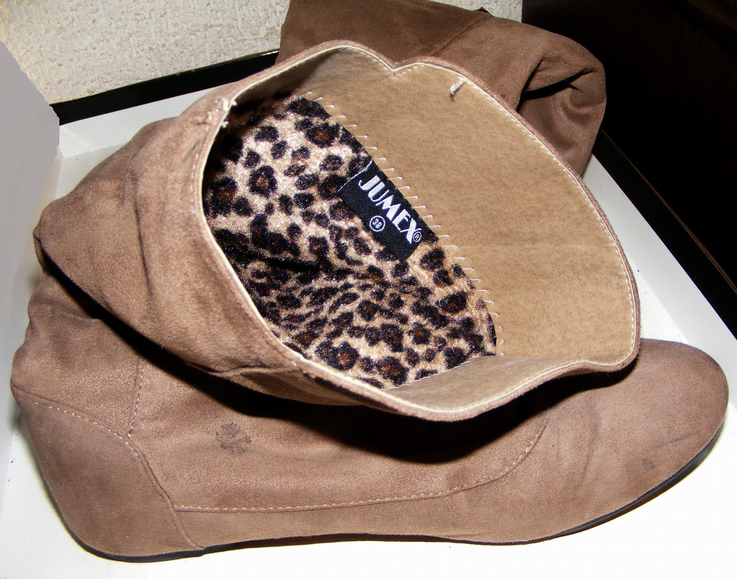 Mit diesen zu kleinen Teenie-Schühchen ² möchte ich meinem Mann (und natürlich auch mir) mal ´ne kleine Extra-Freude gönnen. Wie ihr wißt, darf er ja meine getragenen Schätze nur von Außen "Behandeln". Doch wenn wir uns bei passender Gelegenheit mal wieder bis zum Heizkeller "Durchgekämpft" haben, werde ich ihm ein zartes Schühchen (Pumps oder Ballerina) auf seine Keule stecken, mit dessen Spitze, nach etwas "Vorarbeit" mit meinen Daumen, er dann in meinen Teddy Einfahren und gleichzeitig den Schuh von Innen "Veredeln" darf. Dann wird unter gemeinsamer "Anteilnahme" das Schühchen samt Füllung im Ofenfeuer "Verbrutzelt". Oder, was besonders schön und angenehm ist, ich raffe ihm einen weichen Stiefelschaft (die leopardenfellgefütterten Jumex-Velourstiefel, siehe Bild) über den Kumpel, während ich mir dessen Spitze ins "Bärchenmaul" stecke. Mit meinen beiden Händen werden die Schaftfalten Gerammelt, bis wir Beide möglichst gleichzeitig ... Mit dem Schaft des zweiten Stiefels wird dann "Nachgeputzt" und dieser kommt dann ebenfalls, liebevoll Zusammengerollt, ins Ofenfeuer, unter aufmerksamer Beobachtung des erregenden Flammenspieles. In aller Regel kriege ich dann meist gleich den Nächsten ...