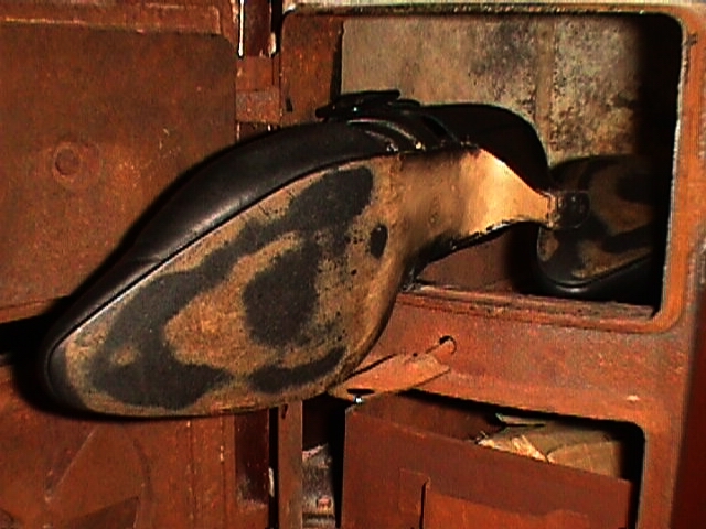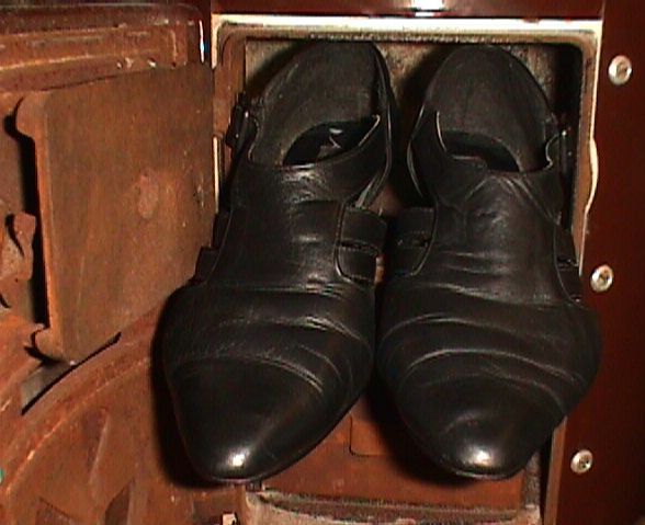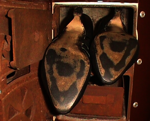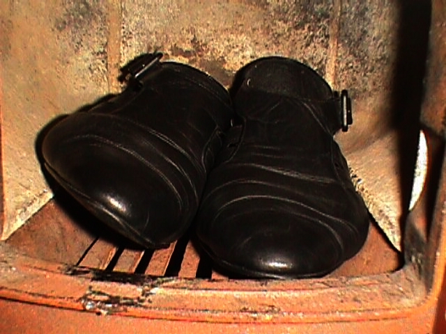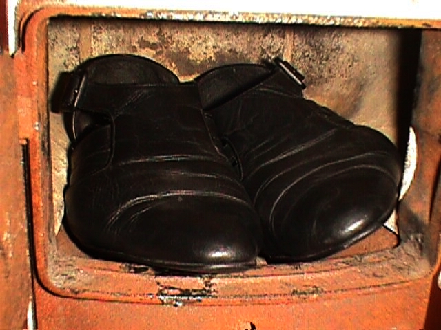 Nun ein Beispiel - eine Demonstrationsveranstaltung mit einem Zwischenrost im Heizungsofen für eine Kollegin, die allerdings nicht überzeugend verlief. Optimal verbrennen Schuhe, wenn sie direkt auf dem Brennholz bzw. auf bereits brennenden Schuhen stehen.