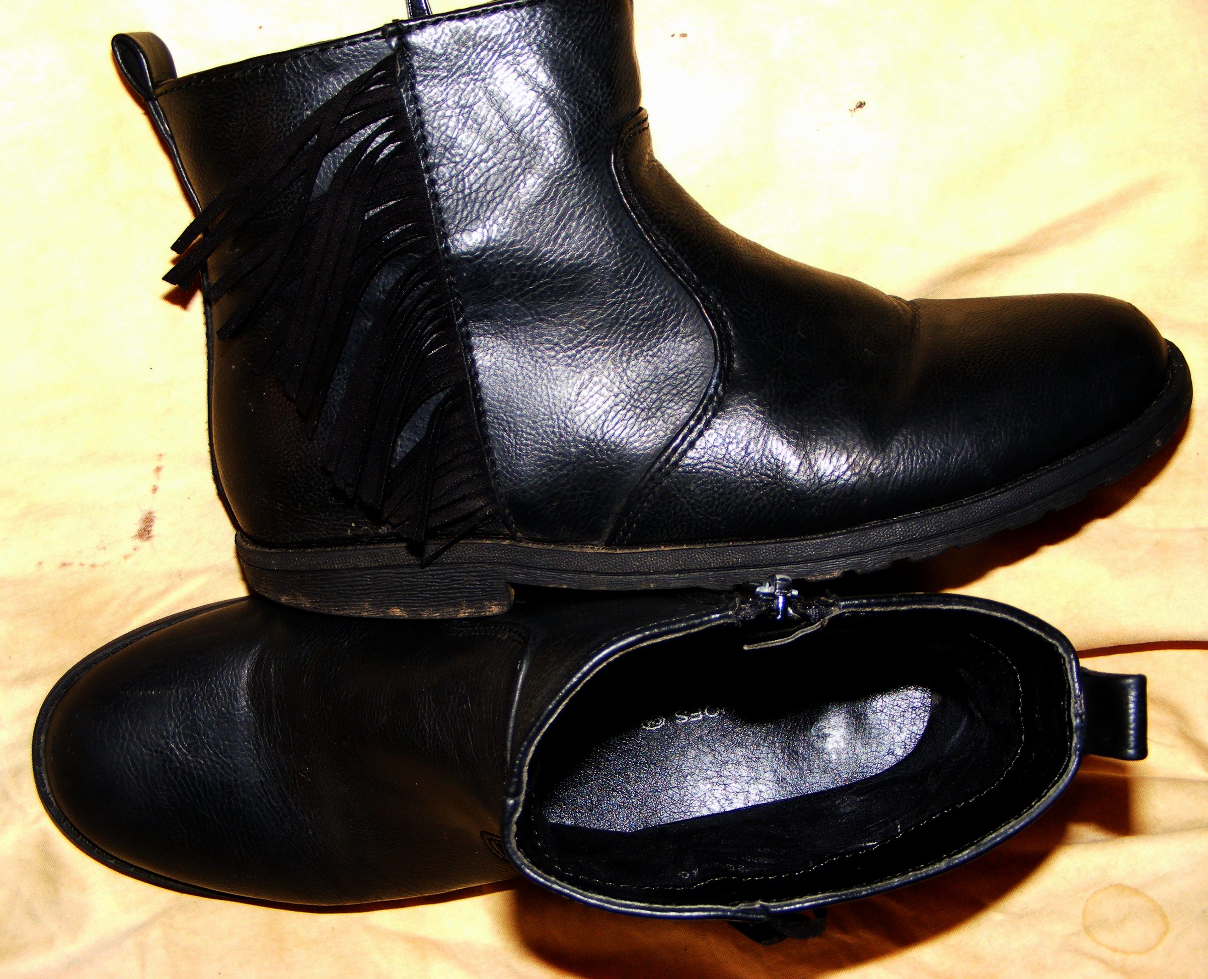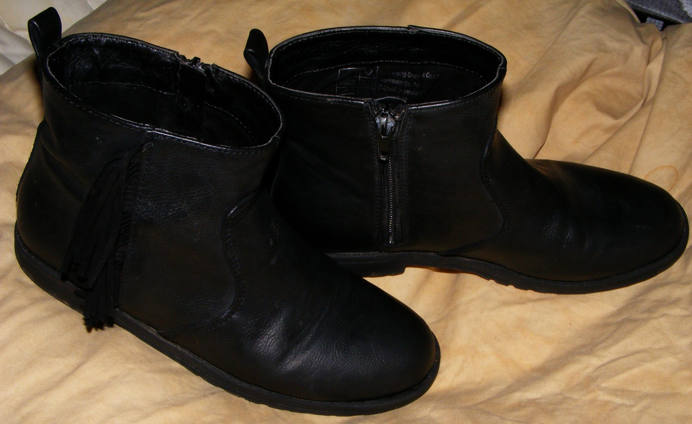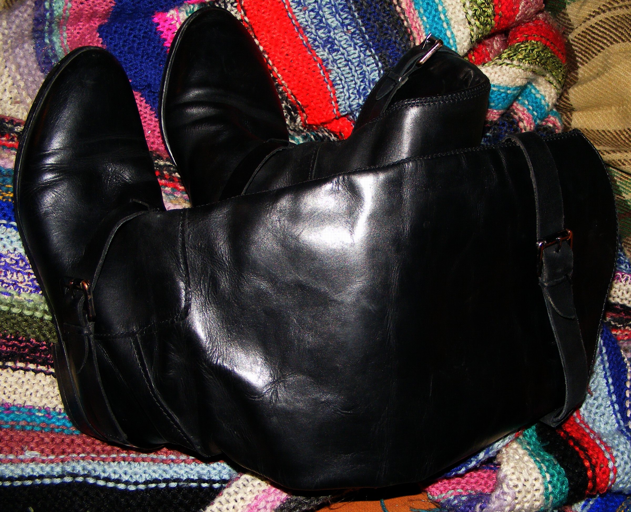 Ich hatte, wie gesagt, einen schwarzen Lederperfecto, eine weiße Zara-Bluse, eine schwarze lange Lederhose und die gezeigten Tangostiefel an. Wider Erwarten verlief das Abendessen erst relativ ruhig und unspektakulär, als mein Mann im Bad war, platzierte ich mich im "Kampfring" (Bett :lol: ). Er kam herein und nach einigen Genießerminuten mit dem kompletten "Haufen knarrenden Leders" zog er mir die Stiefel aus, dann die Hose und den Slip herunter. ² Ganz liebevoll steckte er mir dann wieder die Stiefel an die Füße, raffte die Schäfte so weit es ging nach Unten und massierte mir die Brüste durch das Jackenleder, während ich mit den weichen Stiefelschäften seinen Kumpel so richtig in Stimmung brachte. Dann legte er sich meine Schenkel um seinen Hals und wir "machten Es" auf die allgemein übliche Art ... :)