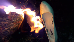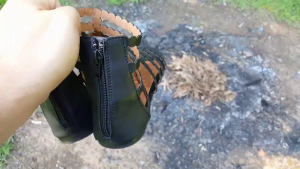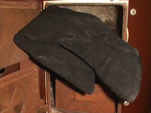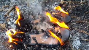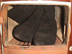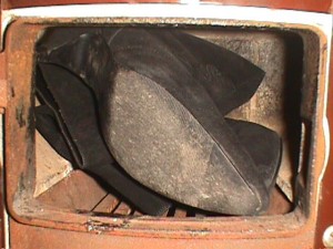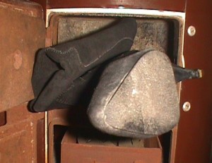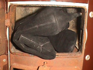 Die leichten Knautschlackschäfte ließen sich einfach um den Fußteil Wickeln und paßten somit gut in die kleine Herdöffnung ... Das Obermaterial verbrannte meist ziemlich schnell im heißen Ofen, beim Nachlegen war meist nur noch der Absatz des vorherigen Stiefels zu Erkennen.