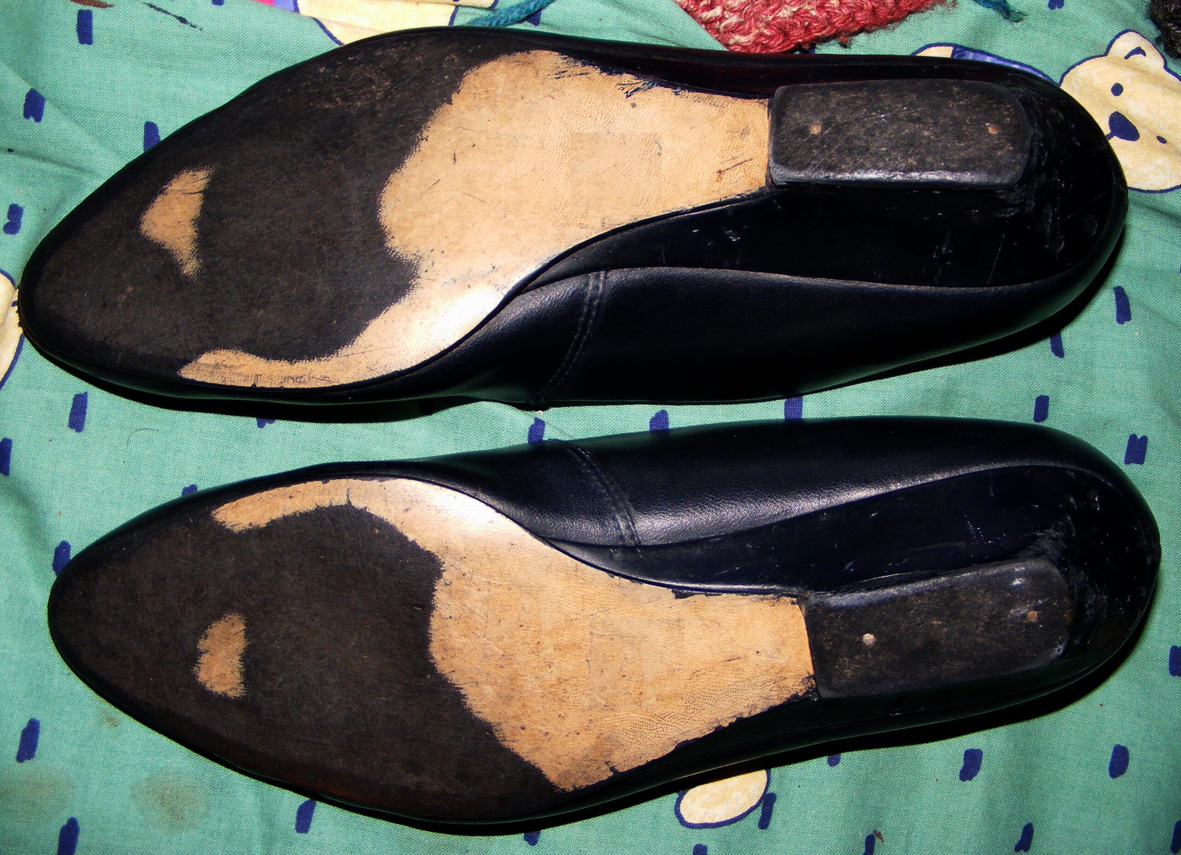 Zuerst ein Paar erregend und reichlich ausgelatschte Lederballerinas. Das Zehenrelief zeigt deutlich ein extremes griechisches Götterfüßchen! Die wahren fußfetischistischen Genießer/innen unter euch dürfen gern Ausrasten: Ich glaube, die Ballis können noch eine Weile von meinen "Hestiafüßen" im Heizkeller gequält werden, bevor ich sie schließlich selbst dem Ofen überantworte. :twisted: