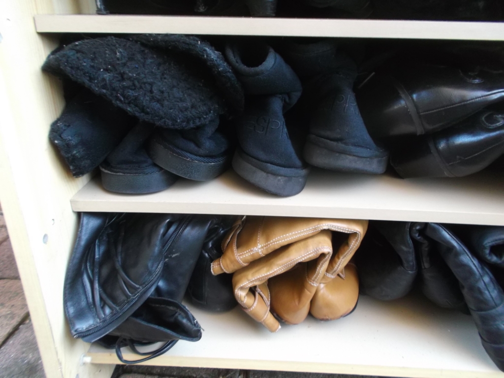 Zwischen den Pumps (links) und dem Stapel abgelatschter Ballerinas lagen sehr geile Stiefeletten und hohe Wildlederstiefel und darunter einige total kaputt gelatschte UGGs.