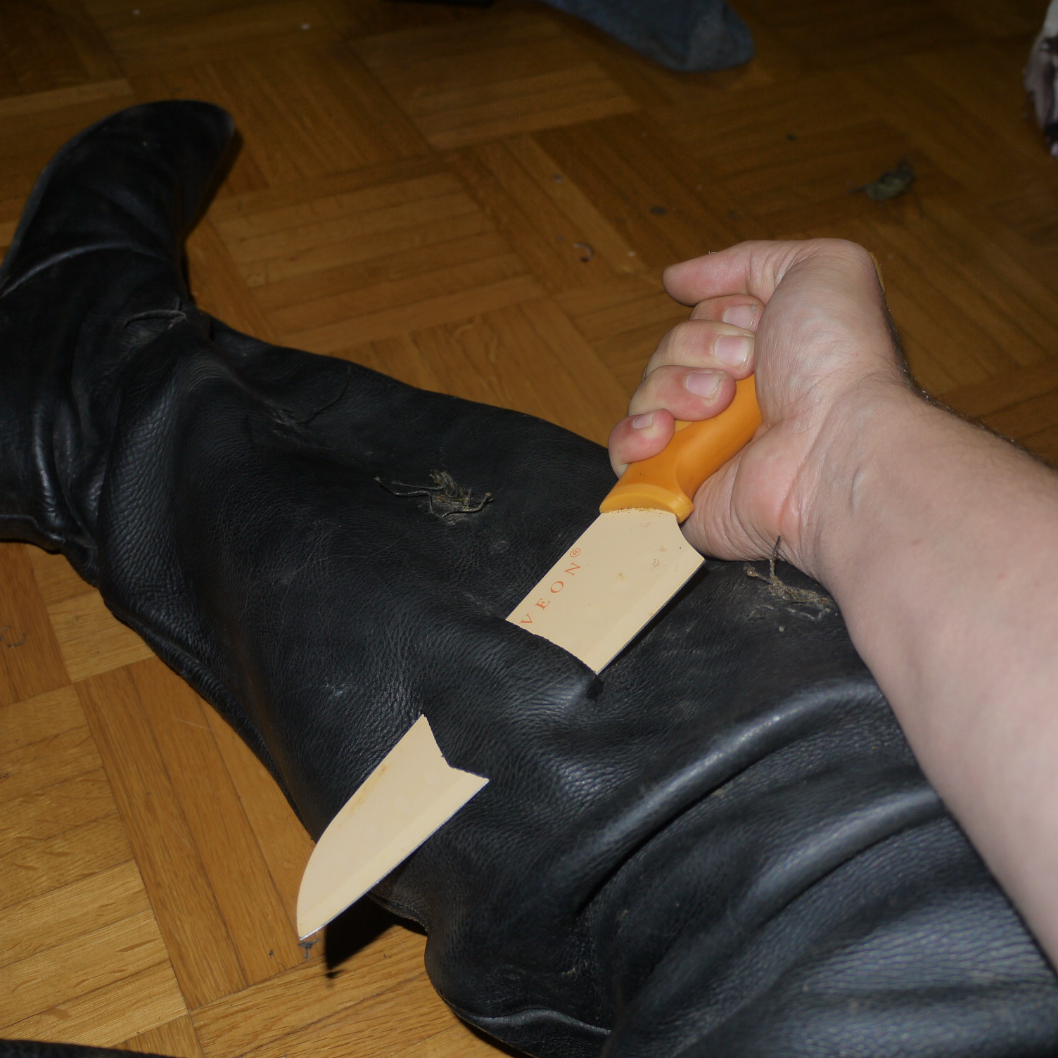 Jetzt sticht Du mit dem Messer so wie es im Stiefel steckt, die Spitze nochmal durch das sicherlich mit viel Sex Aktivitäten getränkte Leder. Das muss doch ein Spass sein.