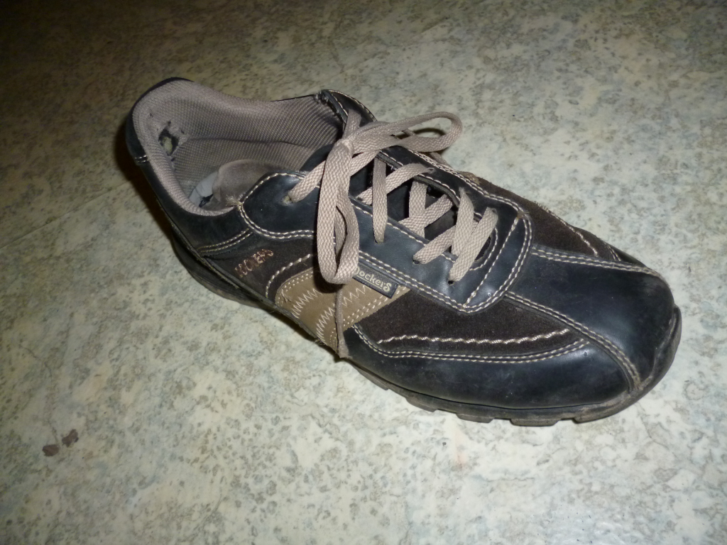 Hier mal ein Update zum übrig gebliebenen rechten Dockers Schuh,da ich nicht so recht weiß wie ich den am schönsten zerstören soll,habe ich mich für den langsamen Weg entschieden,indem der Schuh in der Wohnung langsam zertreten wird,er liegt im direkten Weg ,sodass ich jedes mal drüber laufen muss,waren bestimmt jetzt schon mehrere hundert Male,wie das aussieht zeigen die Bilder und der aktuelle Zustand des einst so lang getragenen und geliebten Treters.Wer noch ein paar Ideen hat,wie ich dem noch zusetzen kann,immer her damit.