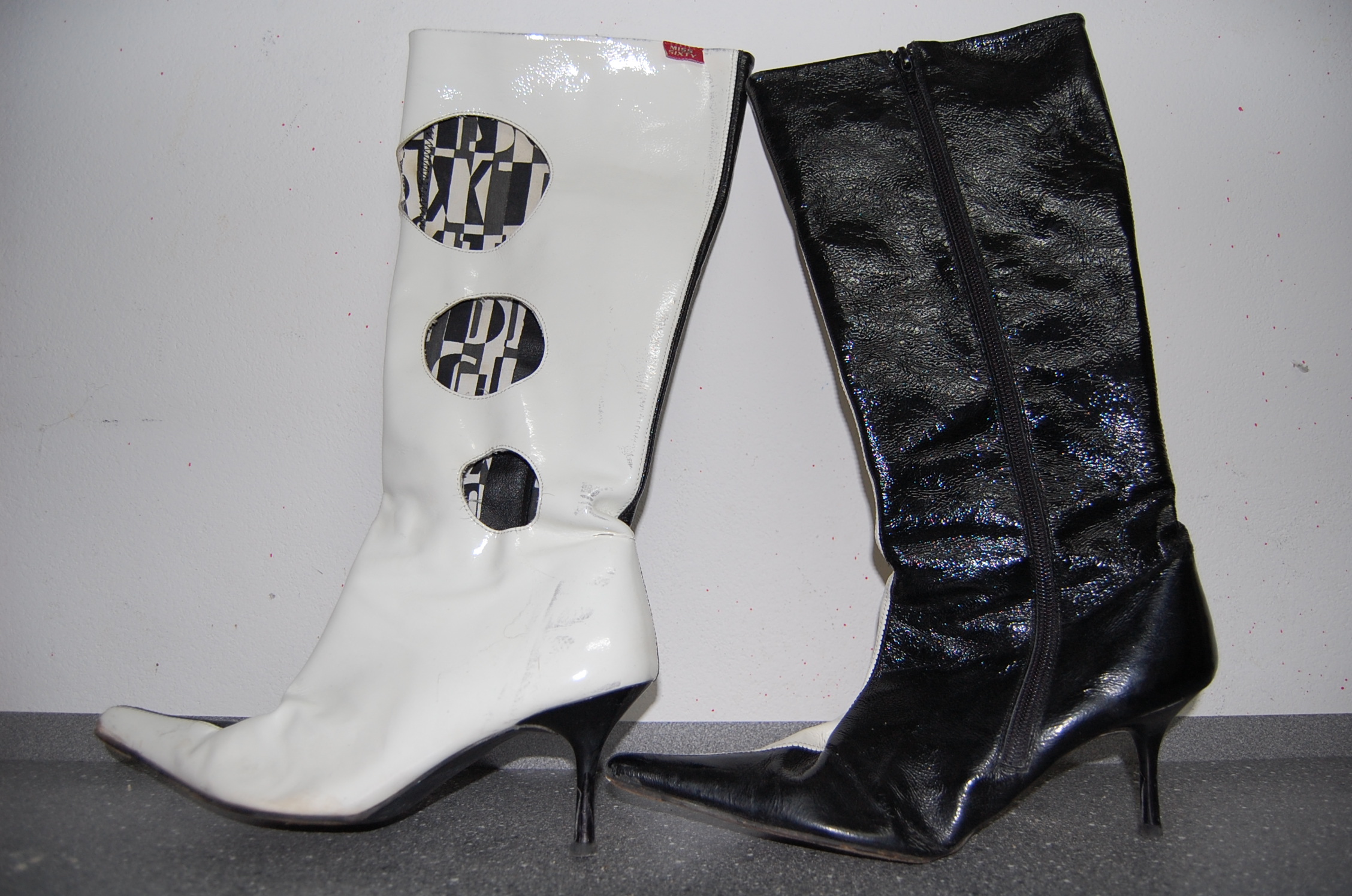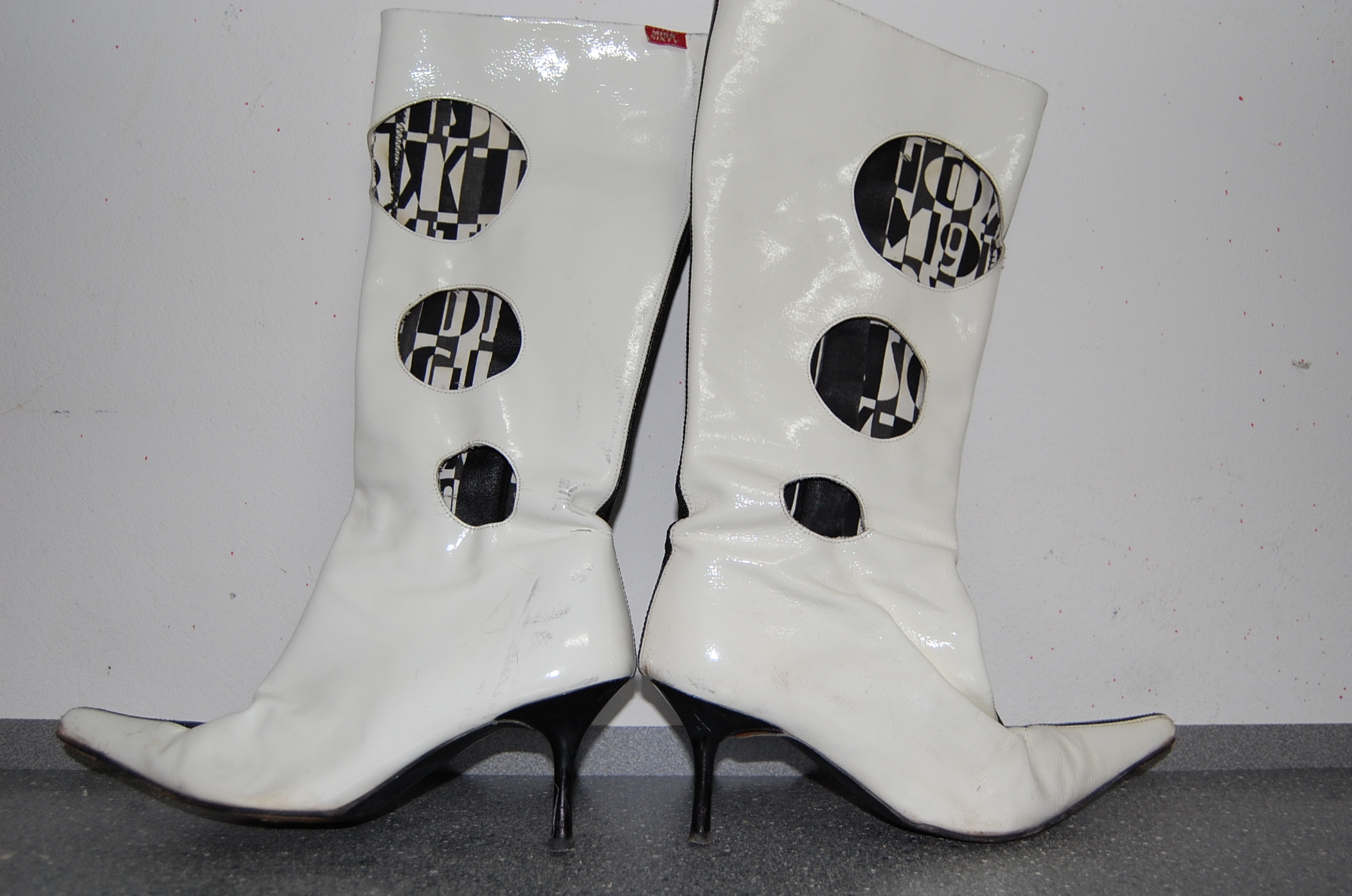 Na ich ahne schon: Wenn diese weißen Kultstiefel „überarbeitet“ worden sind, gibt es zwei Möglichkeiten: Entweder es werden kleine Kunstwerke und die werden irgendwann doch noch im Schuhmuseum in Offenbach landen, oder die tollen superspitzen Linien werden optisch so verschandelt, dass nach teuren Investitionen nur noch ein peinlich-witziger Einsatz bei der Fastnacht folgt und dann müssen die Orangenen Engel diese stiefelgewordene Peinlichkeit entsorgen!