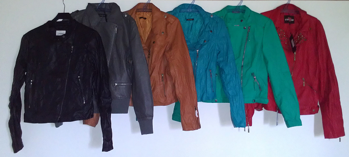 Hier noch eine Auswahl von frechen Damen Jacken aus Kunstleder im aktuellen Biker-Look. Mir gefallen diese sehr und ein Vorteil vom Winterschlussverkauf ist, dass jeweils viel Zeugs aus Kunstleder und anderen plastifizierten Stoffen billig über den Ladentisch geht. Ich habe noch mehr von diesen Jacken, aber ich wollte die Qual der Wahl nicht allzu gross werden lassen. Welche soll ich nun als Testjacke schreddern ?