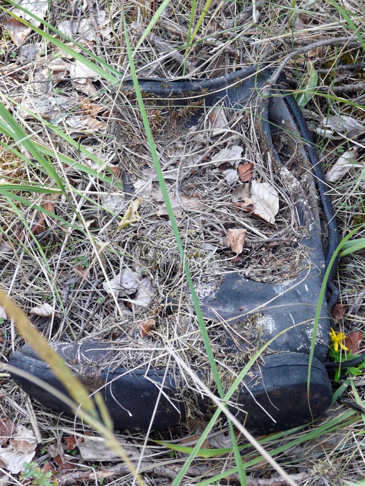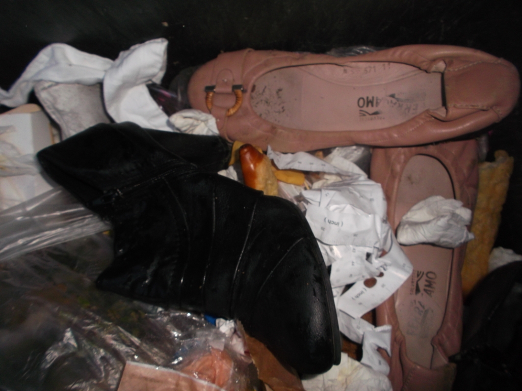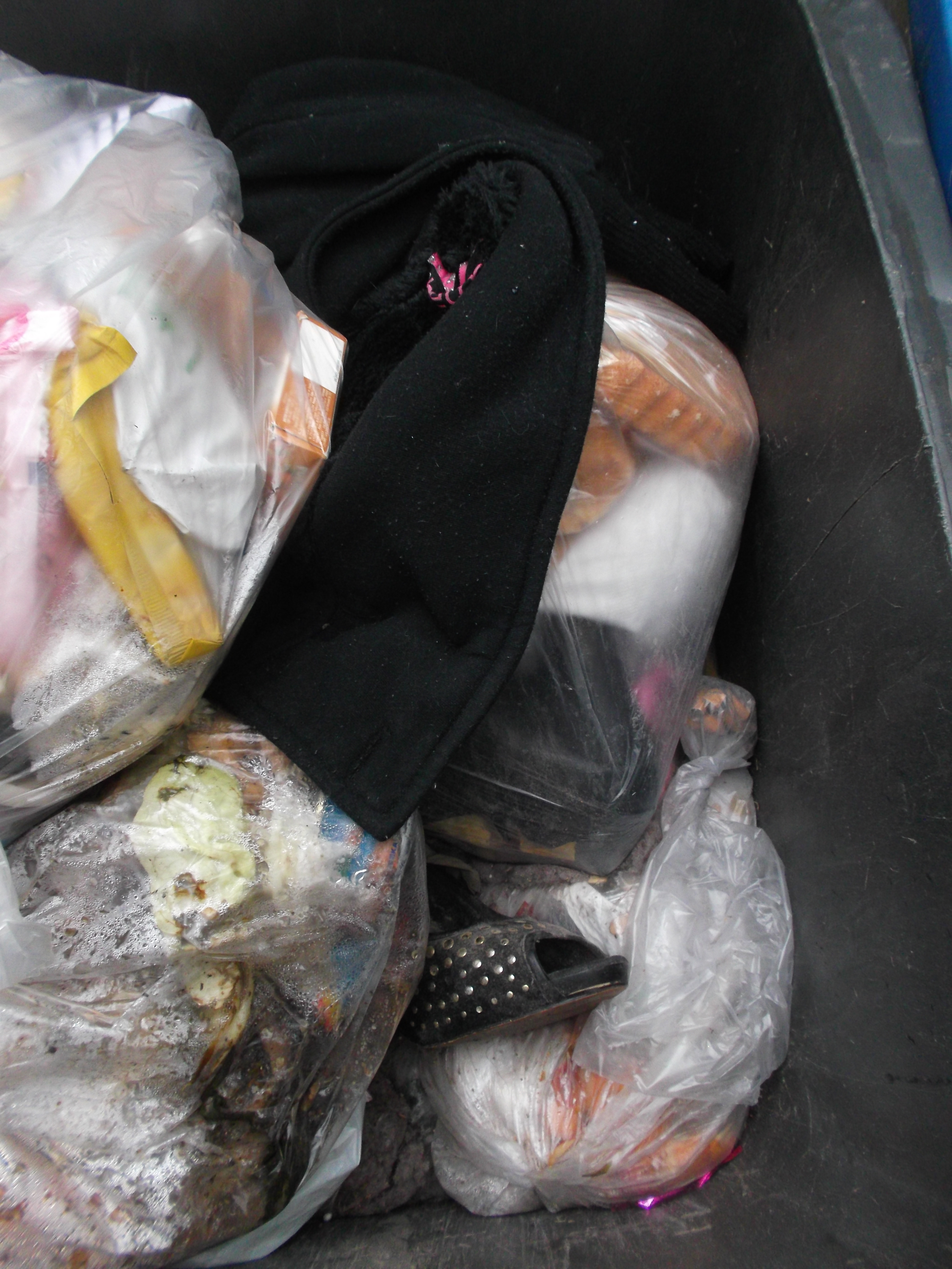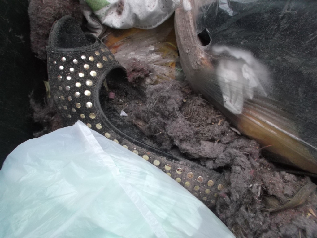 Endlich wieder an der "interessanten" Müllschicht. Erinnert ihr euch noch, dass die eine Schuhspitze des aufragenden Buffalo-Pumps in etwa auf gleicher Höhe wie der Tonnenrand sich befand? Zusammengesackt "nur" durchs Müllgewicht!