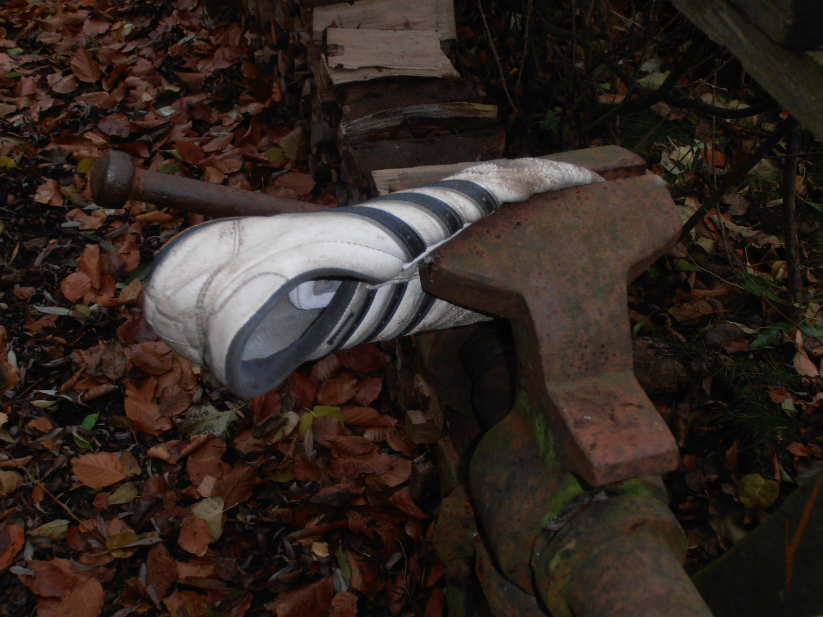 mann bist du aber ein böser! im schraubstock gefoltert! das soch recht feine leder dieser schuhe, mag sowas nicht. unter der platte zu liegen, ist da ja schon besser, für die armen.