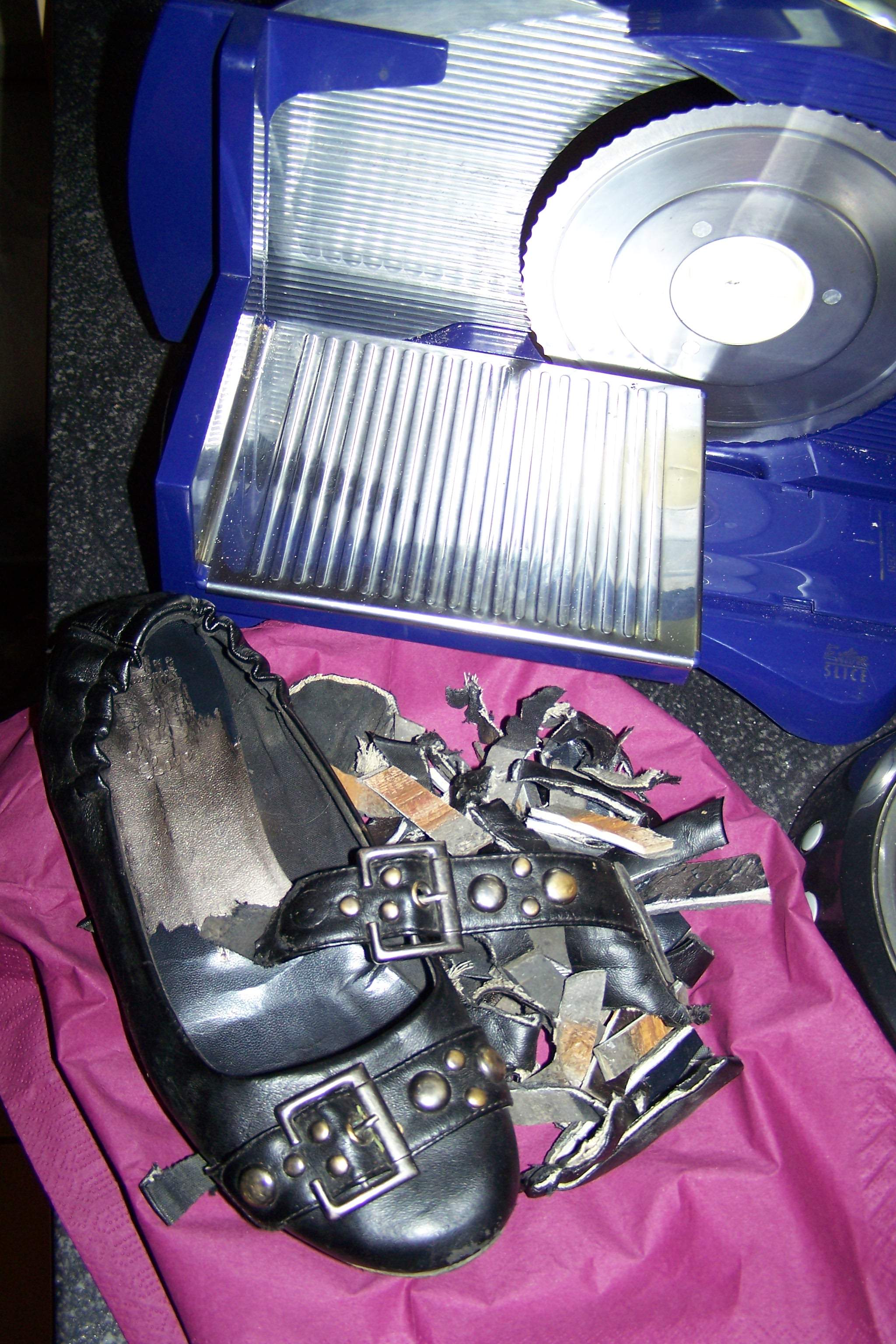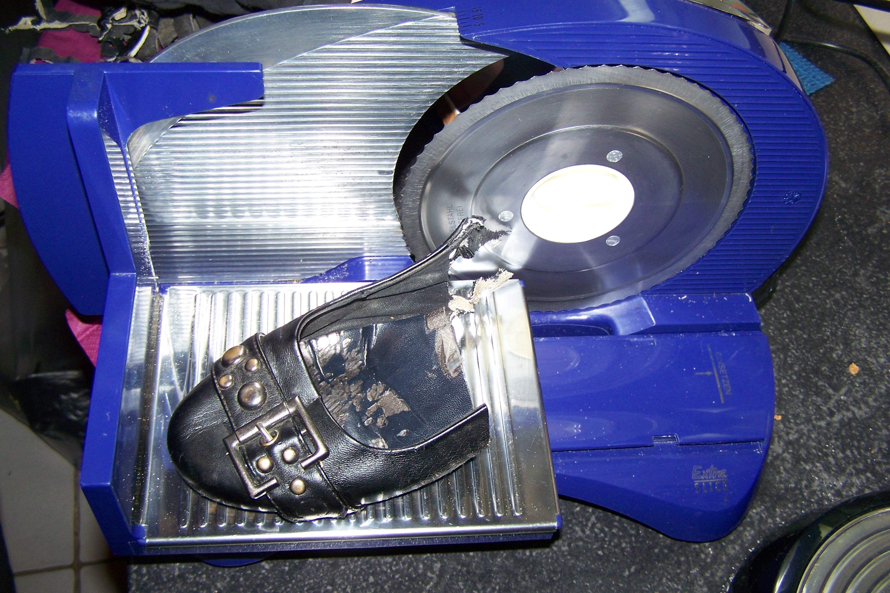 das was ihr da mit der Brotschneidemaschine gemacht habt, hab ich mit einem Messertest geschafft. Hab solche ganz radikal scharfen Messer und hab auch sämtliche Schuhe halbiert etc.
