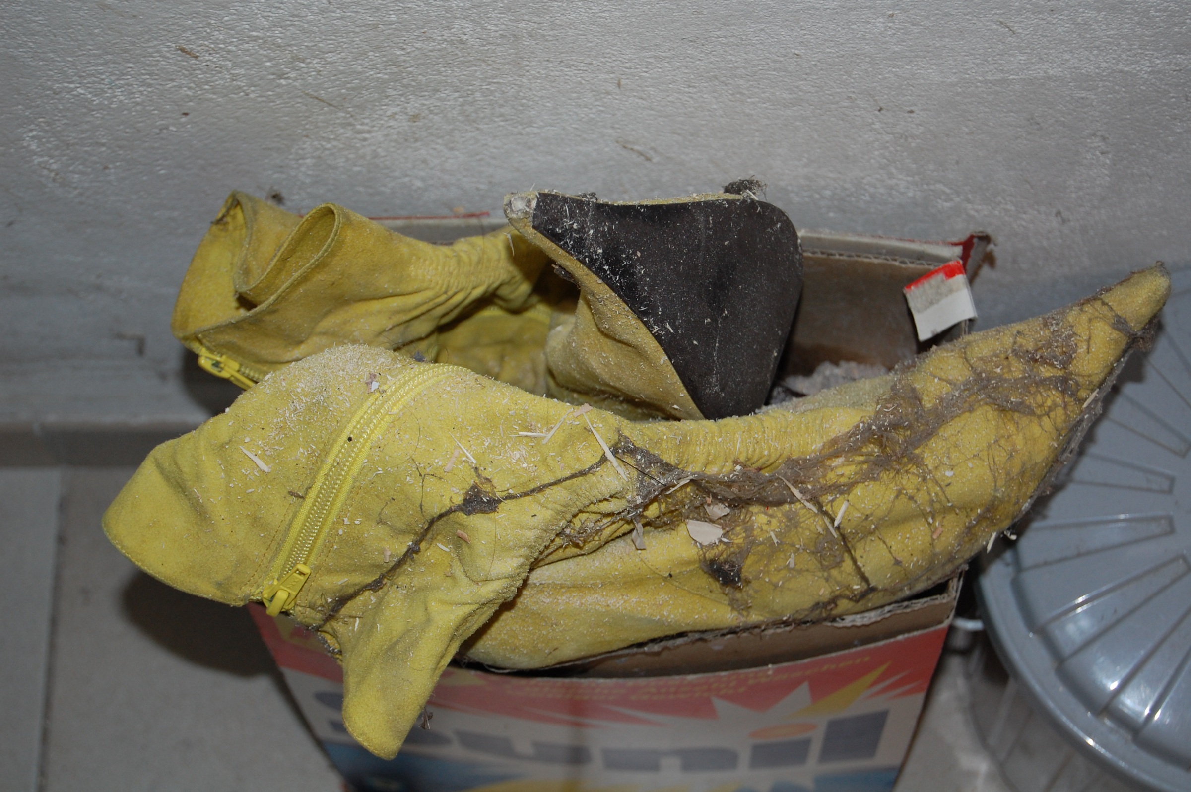 Bei Aufräumarbeiten im Keller wurden die Stiefel plötzlich und unerwarteter weise zum Vorschein gebracht. Überzogen von einer Patina aus Gespinsten und Staub der Wochen und Monaten des Wartens. Aufgrund dieses sich abzeichnenden Bildes stand es für den Aufräumenden im Keller außer Frage, dass diese alten Stiefel nun so wie sie sich gaben, unverzüglich entsorgt werden konnten. Eine formale Abstimmung mit der Besitzerin wurde als entbehrlich erachtet.