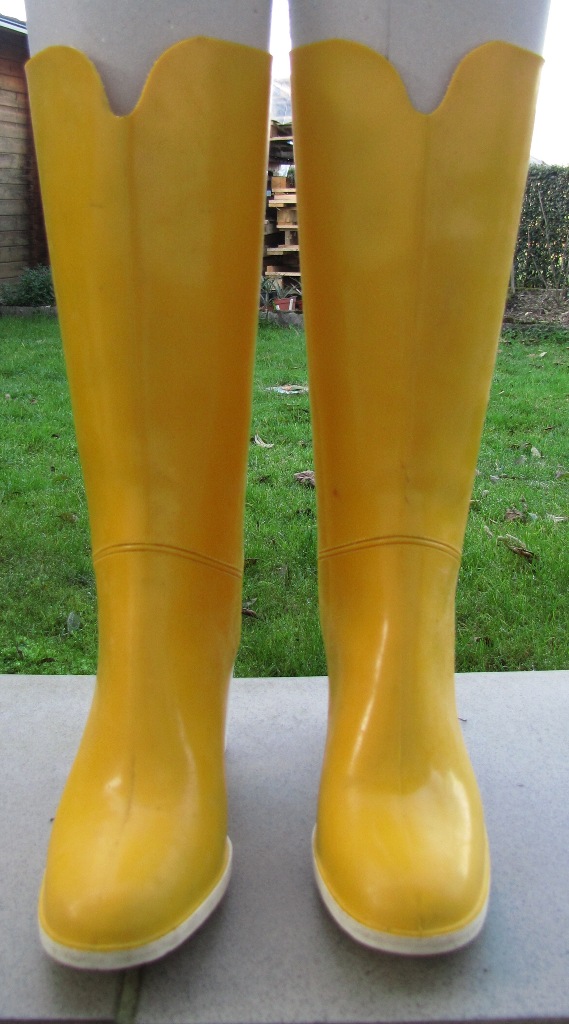 Hier bringe ich ein paar Bilder der gelben Liza Rigon Gummistiefel Grösse 38, Model ist meine Freundin. Die Bilder zeigen die verschiedenen Stadien des kürzen des Schaftes.