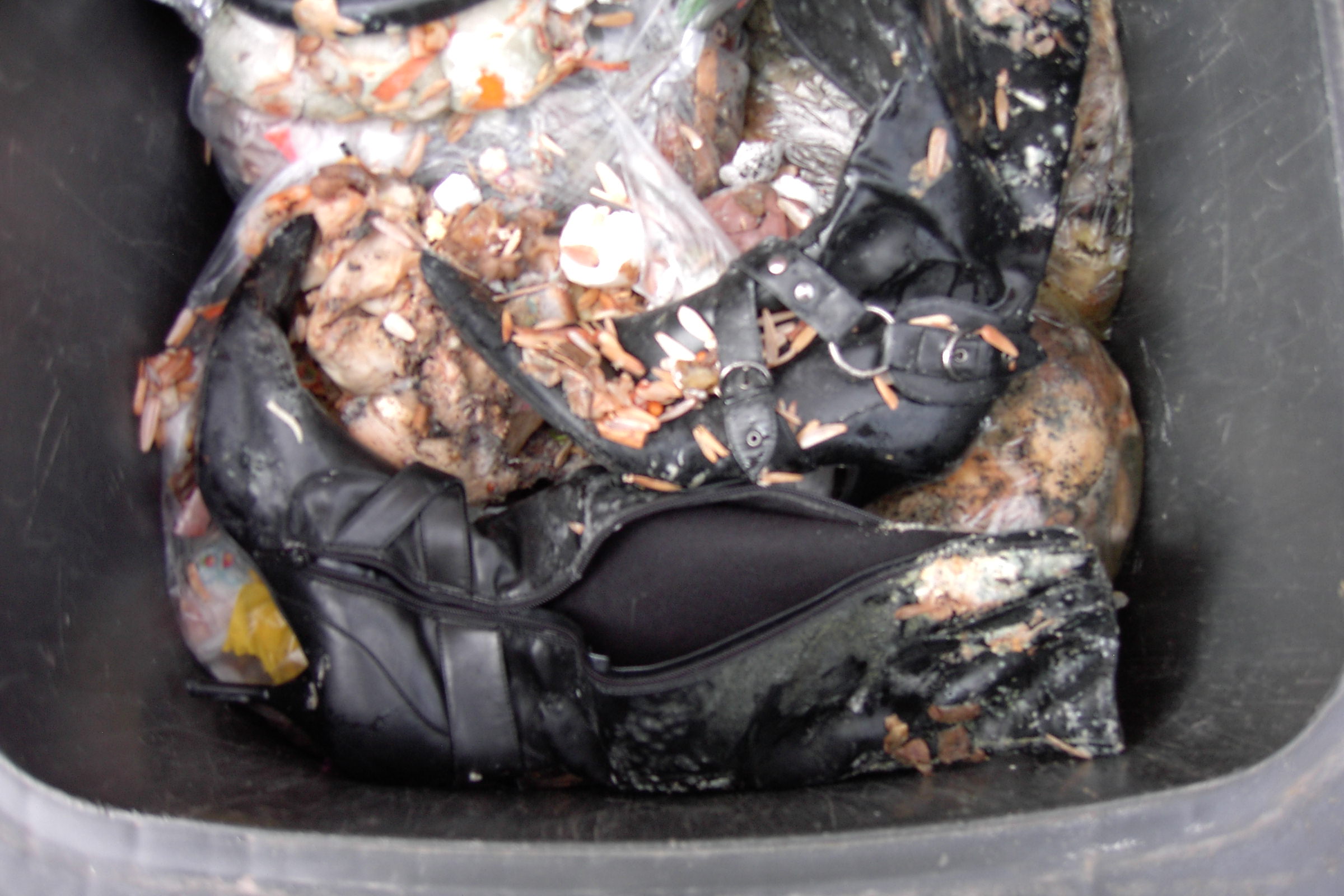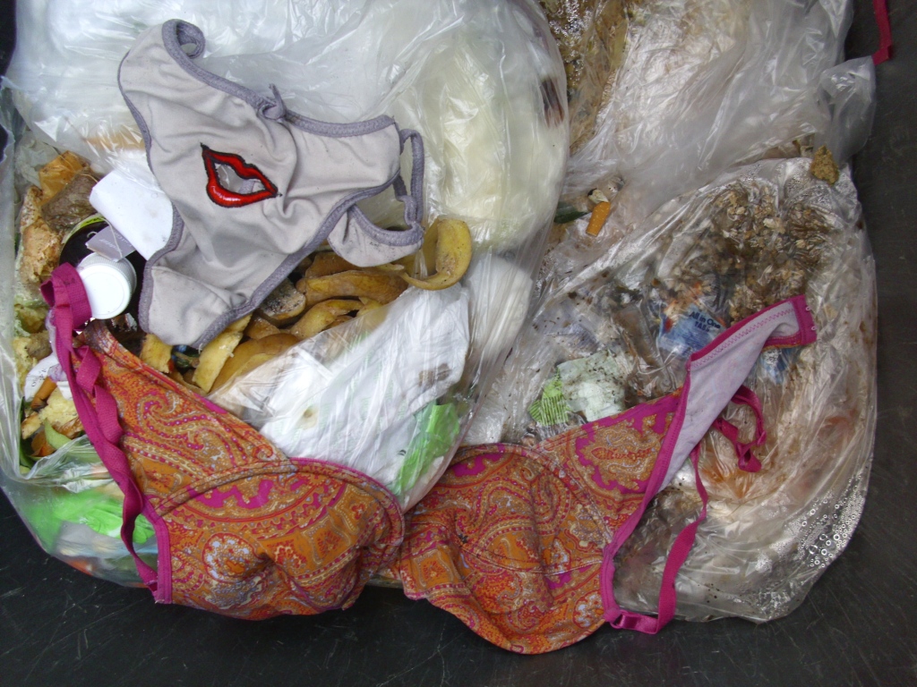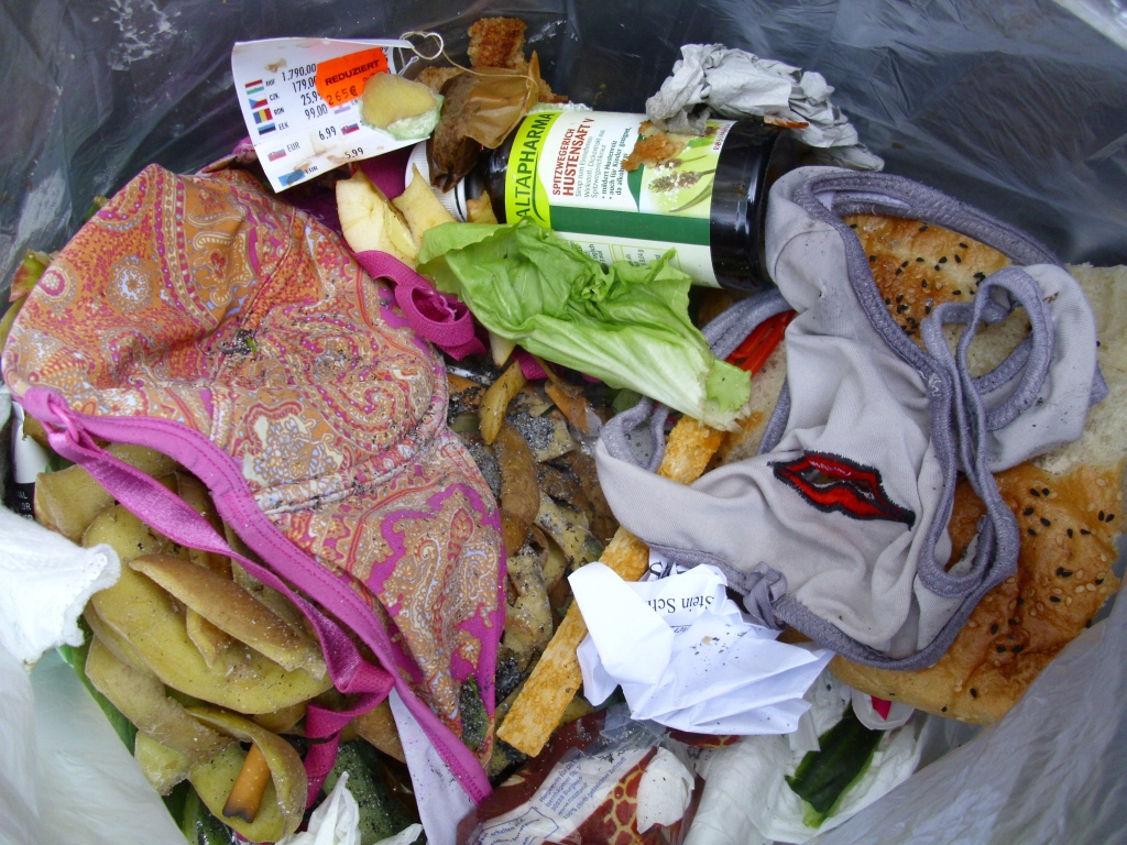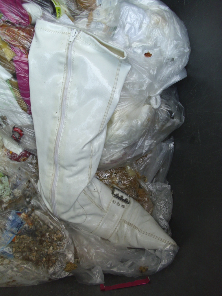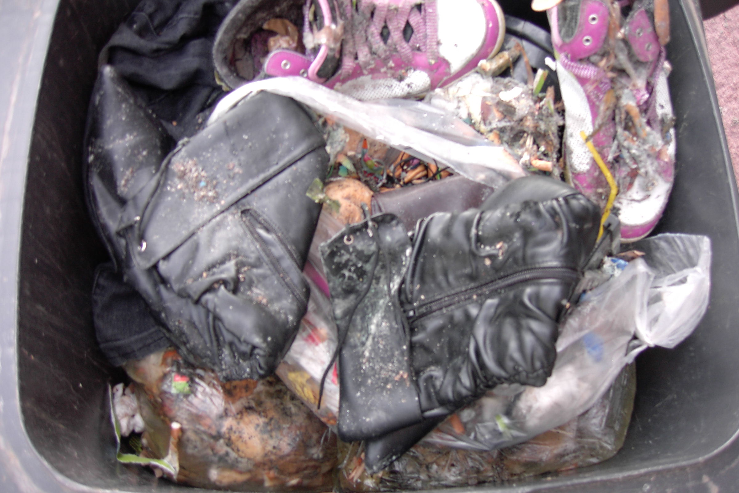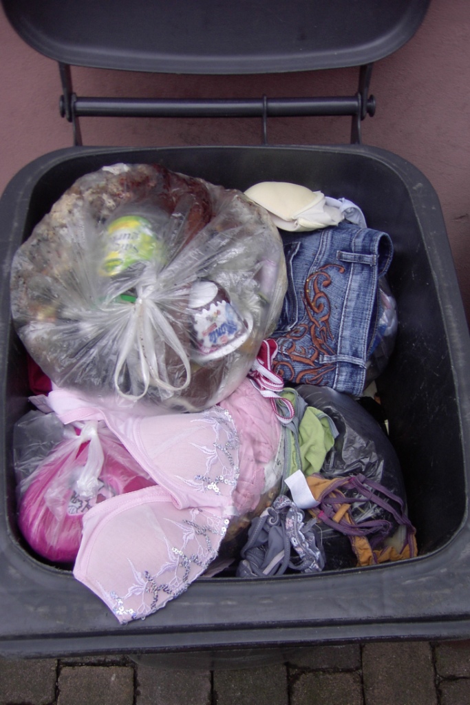 Durch die vielen Personen fällt natürlich einiges an „normalem“ Hausmüll an und auch nicht wenige Küchenabfälle. Aus Hygienegründen kommt davon nichts in die Biotonne. So ergibt sich eine „bunte“ Mischung in unserer Restmülltonne, die man gar nicht vollständig aufzählen kann: Nudelreste und Designerjeans, abgenagte Knochen zu Stringtangas, Kartoffelbrei klebt in Stiefeln, Zigarettenkippen sorgen für echt üblen Gestank in Sneakers, Kehrricht wird auf BHs geschüttet und auslaufende Parfum-Flacons in einer alten Handtasche, versuchen vergeblich gegen den penetranten Müllgeruch der Mülltonne „anzustinken“, zerschlissene geile Oberteile zu welken Salatblättern, verschwitzte, käsige Sneakersöckchen und Nylons liegen bei Badezimmerabfällen, abgestöckelte Pumps und verlatschte Ballerinas kriegen Glas- oder Porzellanscherben ab und ausgekratztes altes Frittenfett auf Mäntel oder Jacken, oder noch viel schlimmer: flüssigheiß in alte Stiefel gegossen.