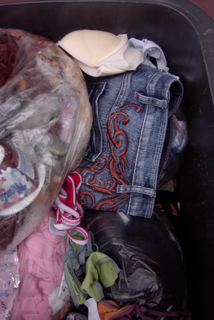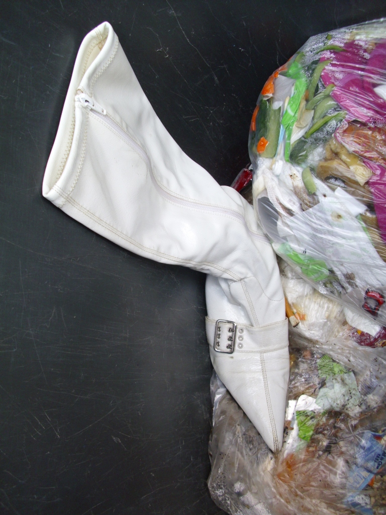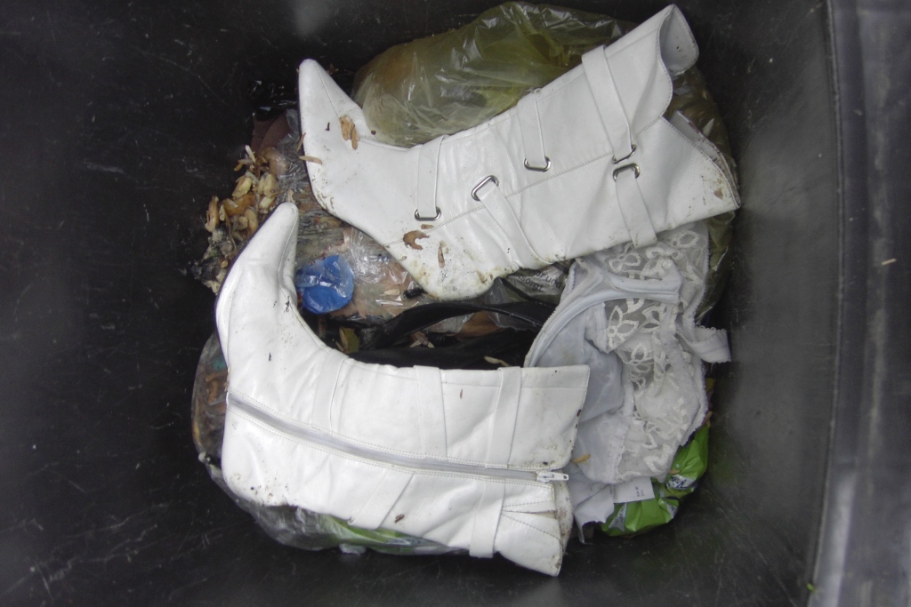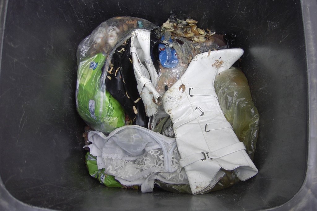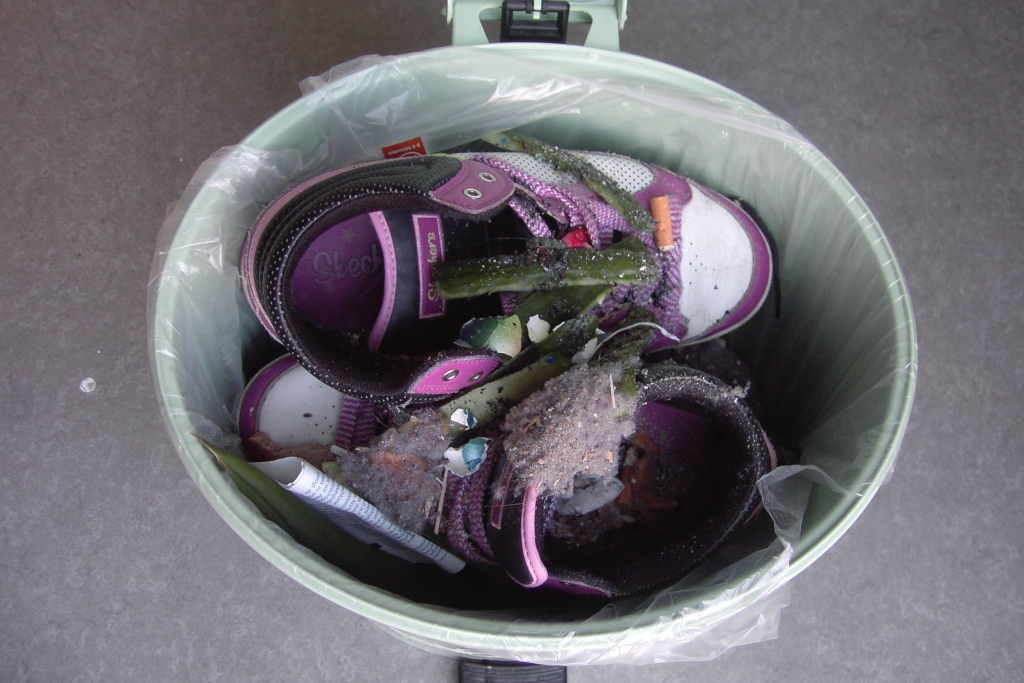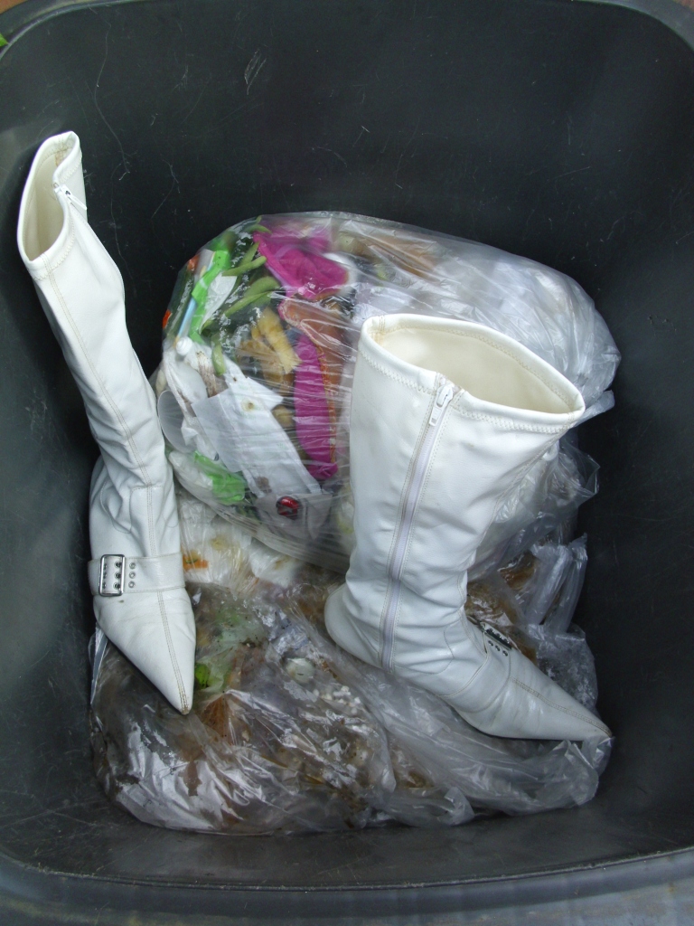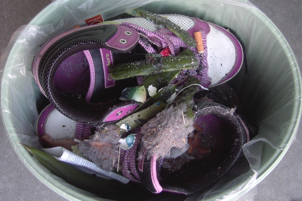 Durch die vielen Personen fällt natürlich einiges an „normalem“ Hausmüll an und auch nicht wenige Küchenabfälle. Aus Hygienegründen kommt davon nichts in die Biotonne. So ergibt sich eine „bunte“ Mischung in unserer Restmülltonne, die man gar nicht vollständig aufzählen kann: Nudelreste und Designerjeans, abgenagte Knochen zu Stringtangas, Kartoffelbrei klebt in Stiefeln, Zigarettenkippen sorgen für echt üblen Gestank in Sneakers, Kehrricht wird auf BHs geschüttet und auslaufende Parfum-Flacons in einer alten Handtasche, versuchen vergeblich gegen den penetranten Müllgeruch der Mülltonne „anzustinken“, zerschlissene geile Oberteile zu welken Salatblättern, verschwitzte, käsige Sneakersöckchen und Nylons liegen bei Badezimmerabfällen, abgestöckelte Pumps und verlatschte Ballerinas kriegen Glas- oder Porzellanscherben ab und ausgekratztes altes Frittenfett auf Mäntel oder Jacken, oder noch viel schlimmer: flüssigheiß in alte Stiefel gegossen.