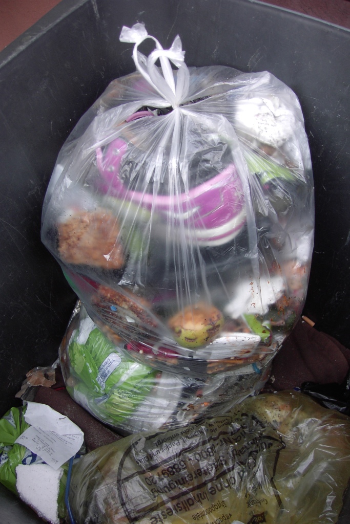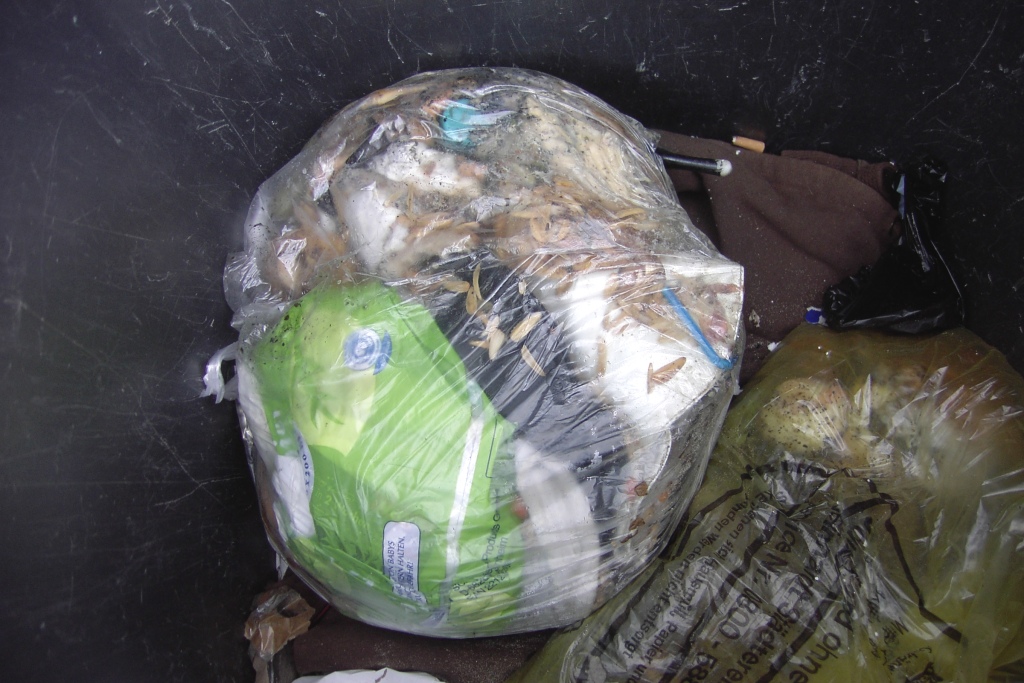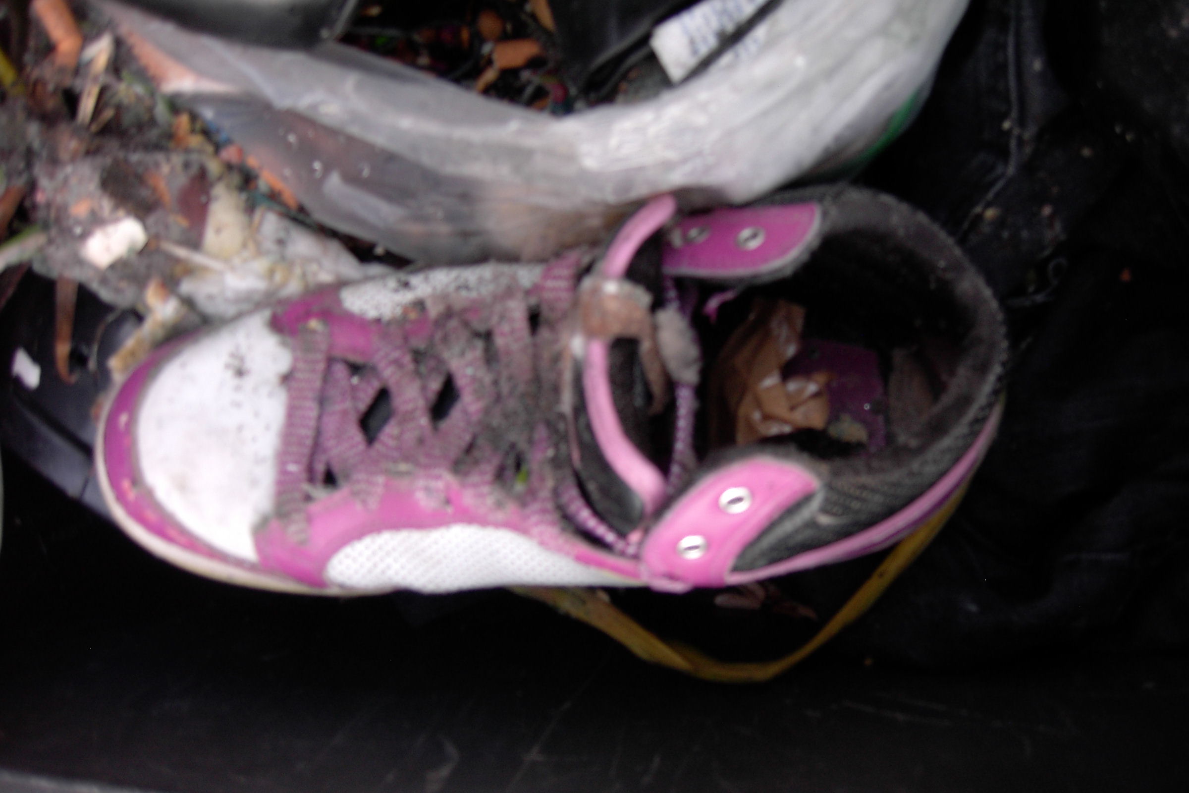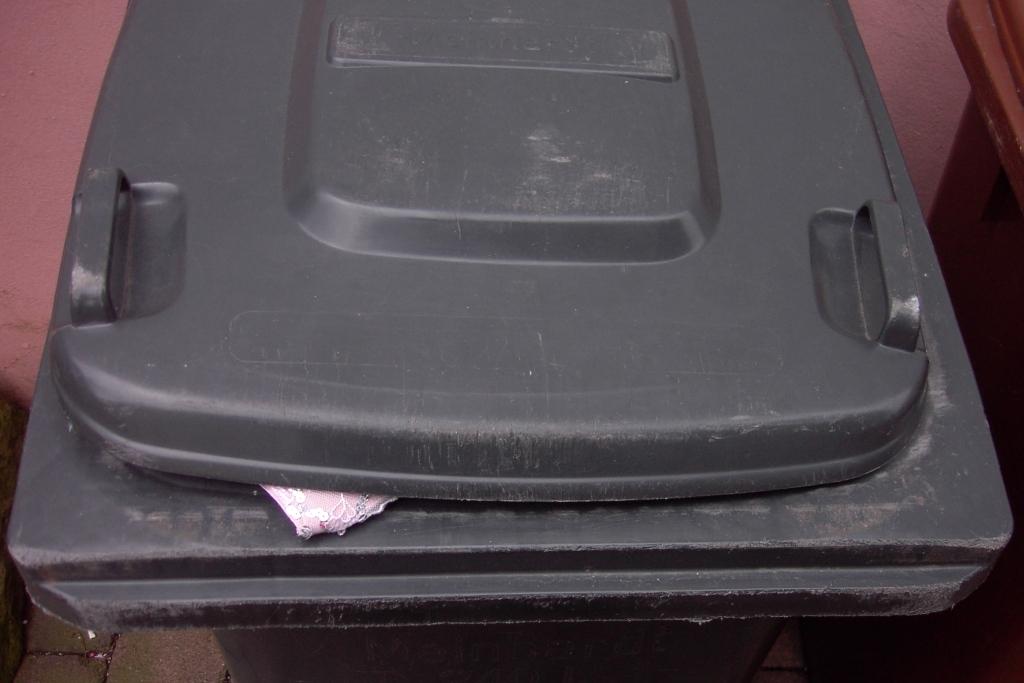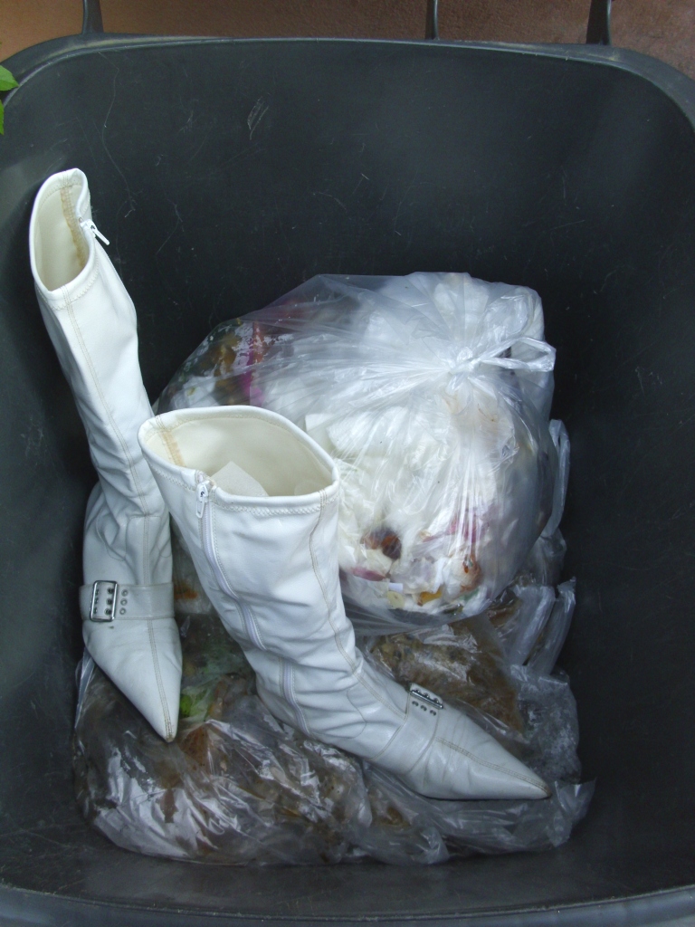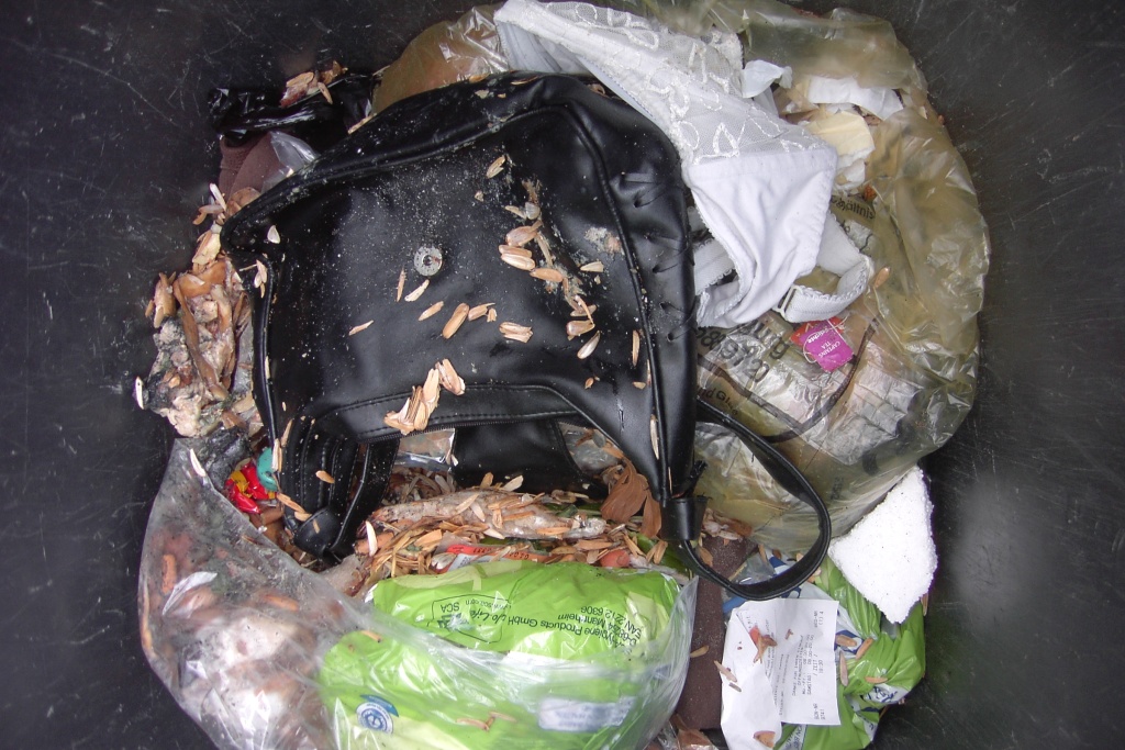 Durch die vielen Personen fällt natürlich einiges an „normalem“ Hausmüll an und auch nicht wenige Küchenabfälle. Aus Hygienegründen kommt davon nichts in die Biotonne. So ergibt sich eine „bunte“ Mischung in unserer Restmülltonne, die man gar nicht vollständig aufzählen kann: Nudelreste und Designerjeans, abgenagte Knochen zu Stringtangas, Kartoffelbrei klebt in Stiefeln, Zigarettenkippen sorgen für echt üblen Gestank in Sneakers, Kehrricht wird auf BHs geschüttet und auslaufende Parfum-Flacons in einer alten Handtasche, versuchen vergeblich gegen den penetranten Müllgeruch der Mülltonne „anzustinken“, zerschlissene geile Oberteile zu welken Salatblättern, verschwitzte, käsige Sneakersöckchen und Nylons liegen bei Badezimmerabfällen, abgestöckelte Pumps und verlatschte Ballerinas kriegen Glas- oder Porzellanscherben ab und ausgekratztes altes Frittenfett auf Mäntel oder Jacken, oder noch viel schlimmer: flüssigheiß in alte Stiefel gegossen.