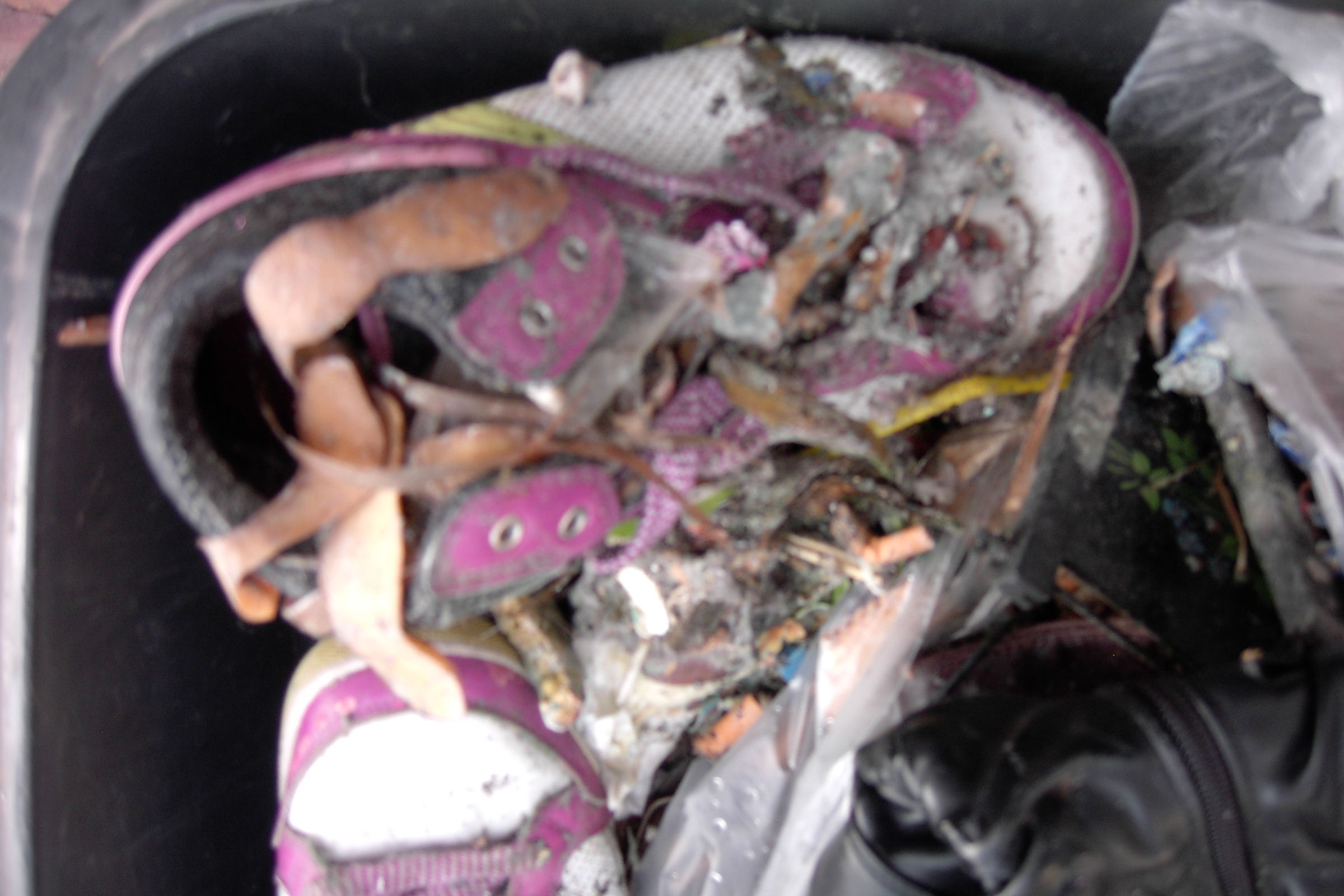 Die geilen Lumpen und die Schuhe saugen die durch beginnende Verrottung entstehende „Müllbrühe“ einigermaßen auf und so wird der Müllgestank halbwegs im Griff behalten