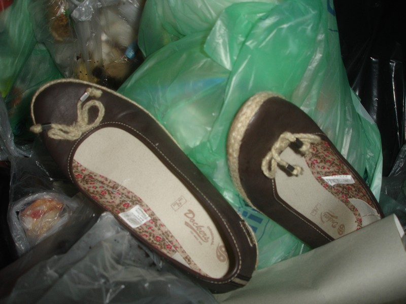 - die Ausbeute, die ich mitgenommen habe... habe zufällig noch bei einer anderen Tonne, die schon für die MVA bereitstand, noch die weißen Reeboks entdeckt, deren Sohle sich schon ordentlich gelöst hat.