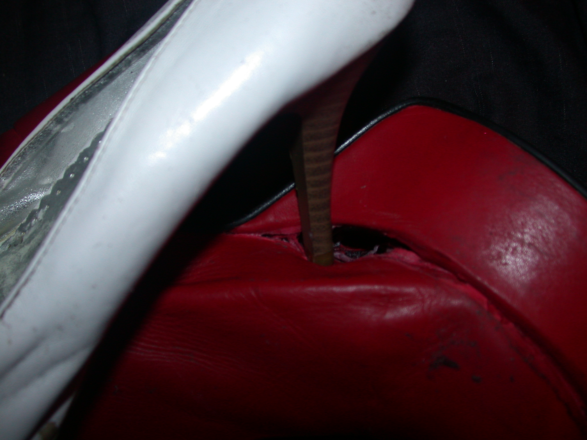 Die Schäden von den weißen Pumps könnte man zumindest optisch reparieren und der lose Absatz ist eh egal, wenn die Stiefel von den Orangenen Engeln in die Müllschüttung geschleudert werden