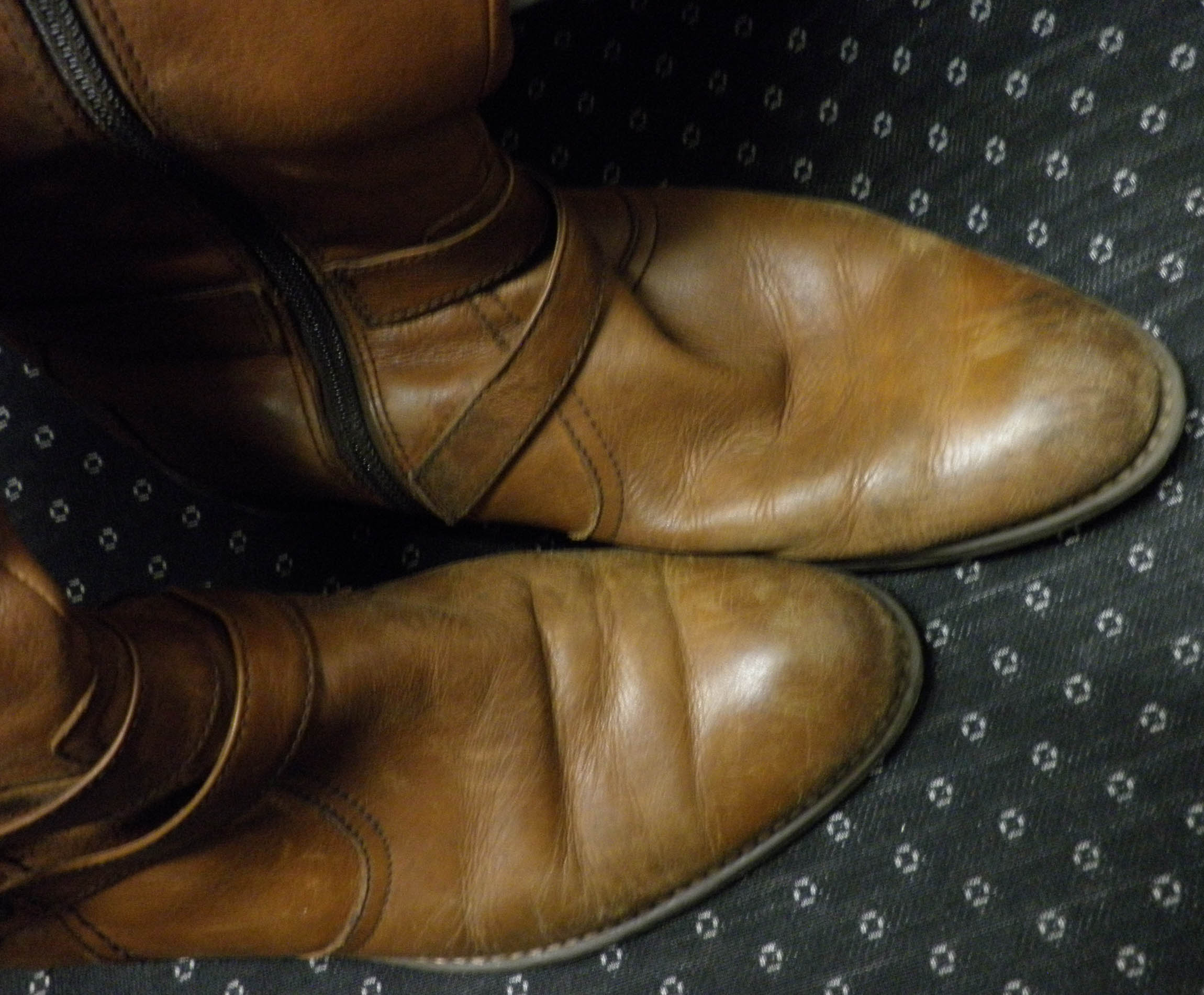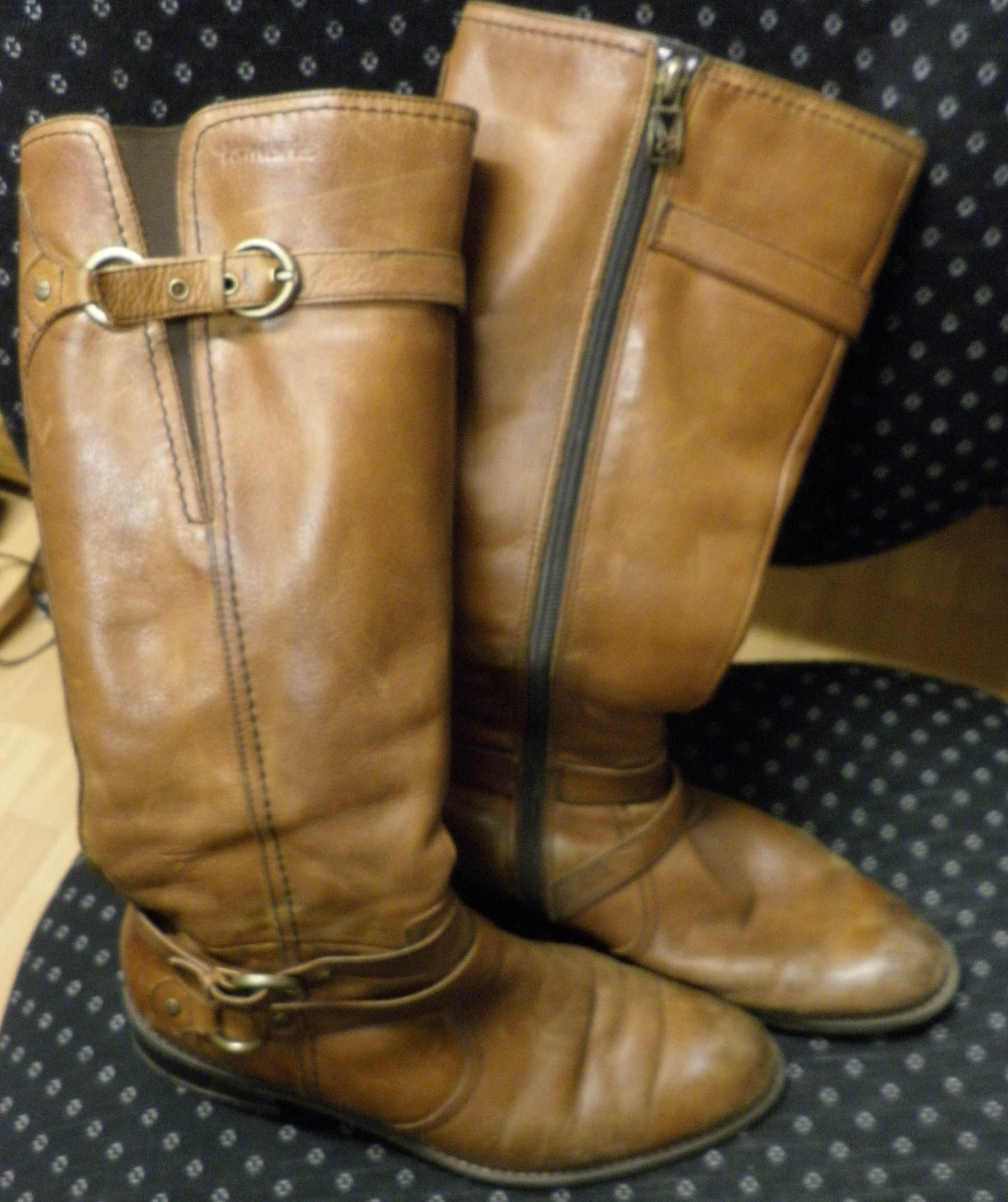 Klar, erst einmal blöder Blick, dann die Frage, was ich denn vorhätte. Wie in einem anderen Betrag als Tipp bekommen, sagte ich, dass eine Kegelschwester sich neue Stiefel wünscht und wir als Klubmitglieder gesammelt haben. Statt nun das Geld in einen Umschlag zu stecken, wollten wir das in alten, abgetragenen Stiefeln verstecken und diese Stiefel als Geschenk überreichen. Die Idee fand meine Kollegin lustig und sagte mir, dass ich die Stiefel haben könne. Am nächsten Tag war für mich wie Weihnachten: jahrelang beobachtete und geschundenen Stiefel sind nun mein.