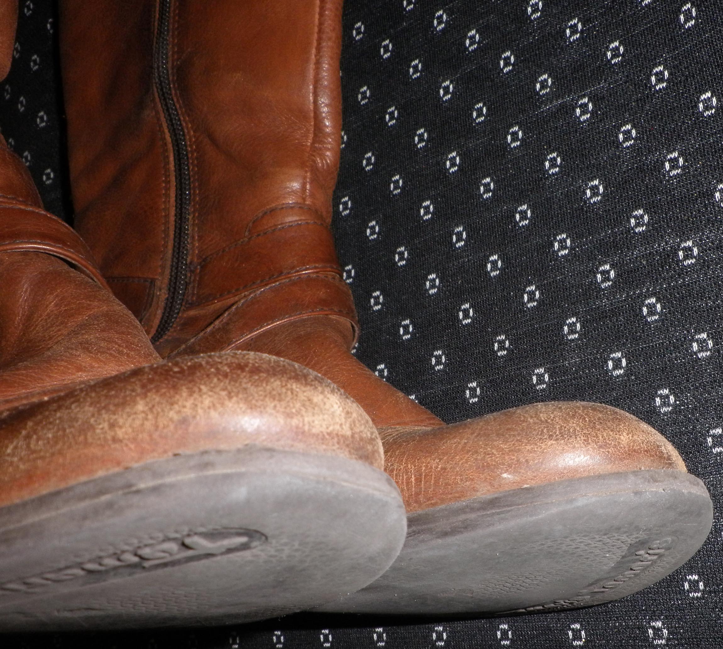 Ich bekam eine Unterhaltung zweier Arbeitskollegen über Schuhe und deren Reparaturen mit. Die Kollegen mit den abgetragenen Stiefeln (Bilder unten) sagte mit Hinblick auf ihre Selbigen, dass sich oft eine Reparatur nicht lohnt. Zwar könnte man diese Stiefel noch mit einer neuen Sohle und einem neuen Absatz ausrüsten, aber ob die Stiefel dann noch länger getragen werden, besonders wenn das Leder etwas angegriffen ist, ist dann fraglich. Jetzt kam ich ins Spiel mit der Bitte, für ein "Überraschungsgeschenk" die Stiefel haben zu wollen, wenn sie sich nicht für eine Überarbeitung entscheidet.