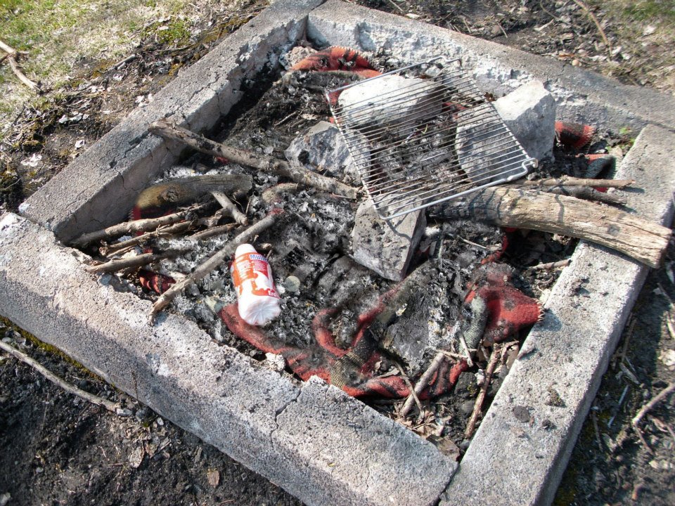 Jemand hatte sie aus dem Wald mitgenommen und den Grill damit angezündet. Eine Wolldecke wärmt also nicht nur am Lagerfeuer, sondern auch als Lagerfeuer :D