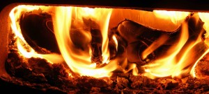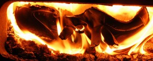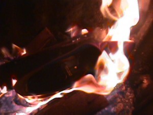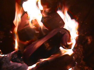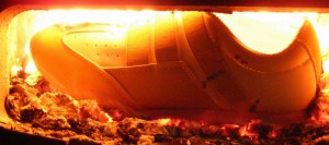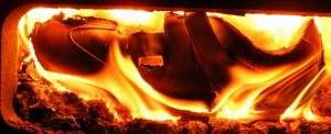 Die Hitze der Holzglut war nicht mehr ganz so heftig, der erste Schuh brannte jetzt langsamer, sodaß ich, auf dem Fußboden liegend, bei geöffneter Feuertür beobachten konnte, wie er sich in den Flammen windete und krümmte. Dessen Ledersohlen widerstanden ziemlich lange den Feuer, vermutlich hatte deswegen meine Mutter ihre Angewohnheit, die Schuhe "kopfstehend" aufzulegen. Vom Absatz fielen brennende Tropfen in den Aschekasten. Dann flog auch der Zweite ins Feuer, ihm folgten noch zwei Paar schwarze Lacklederballerinas, die nicht fauchend, sondern eigentümlich knisternd mit blau-grünen Flammen verbrannten. Dann war fürs Erste das Wasser bereit für ein Wannenbad. So schaffte ich in täglicher Wiederholung, den ganzen Berg Altschuhe zu verarbeiten. Später habe ich entschieden, nicht mehr so lange zu warten. Als ich zunehmend nur noch Stiefel als Hausschuhe trug, endeten ausgediente Pumps und Co. in aller Regel unmittelbar nach ihrem letzten Trageeinsatz gleich in meinem Zimmerofen.