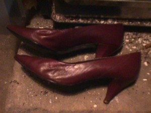 Auf Grund meiner Vorliebe für bereits getragene Stiefel lasse ich keine Gelegenheit aus, alle erreichbaren Flohmärkte anzufahren. Die meisten Echtlederschuhe und -stiefel bleiben, seit jeher vorbildlich gepflegt, noch im Einsatz. Natürlich kann ich im Sommer nicht ständig in Stiefeln herumlaufen. Für die alltäglichen Wege und auf Reisen bevorzuge ich schwarze oder rote flache Lederschnürschuhe sowie klassische Pumps mit hauchdünnen Sohlen und schwarze, dunkelblaue und weiße Adidas-TKD-Schuhe, die ich ebenfalls zumeist von Bekannten, Flohmärkten oder aus Sperrmüll beschafft habe. Da ich diese bereits Gebrauchten üblicherweise bis über die Nutzungsgrenze abtrage, landen sie immer gleich im Ofen. Analog dazu mag ich es, um meine hochwertigen Sammlerstücke besonders bei übelstem Matschwetter zu schonen, auch noch alle passenden Stiefel aus dem Brennstoffbestand abzutragen, je nach Anlaß werden sie dafür sogar noch mit Schuhkreme gepflegt!