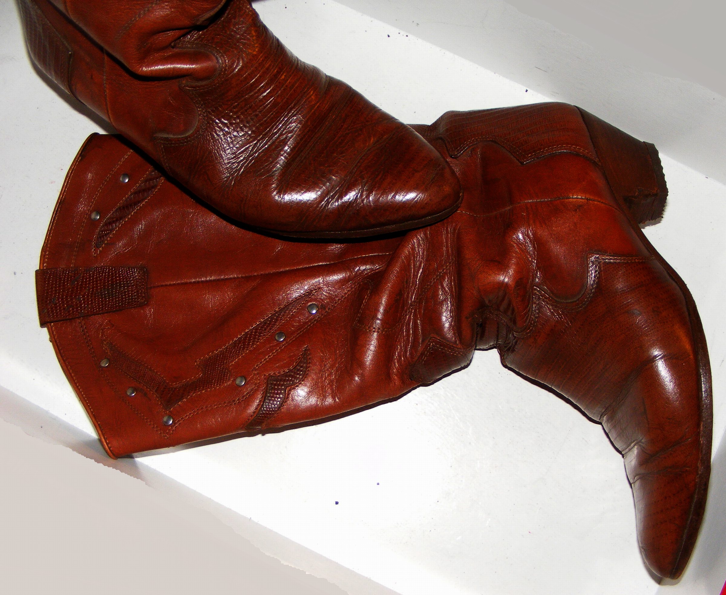 Diese schönen weichen und extremweiten Lederstiefel (reichliche 41) mit Ledersohlen bekam ich 2003 von einer Bekannten. Sie waren wirklich grausam zugerichtet, total ungepflegt und mit Gummi nachbesohlt.