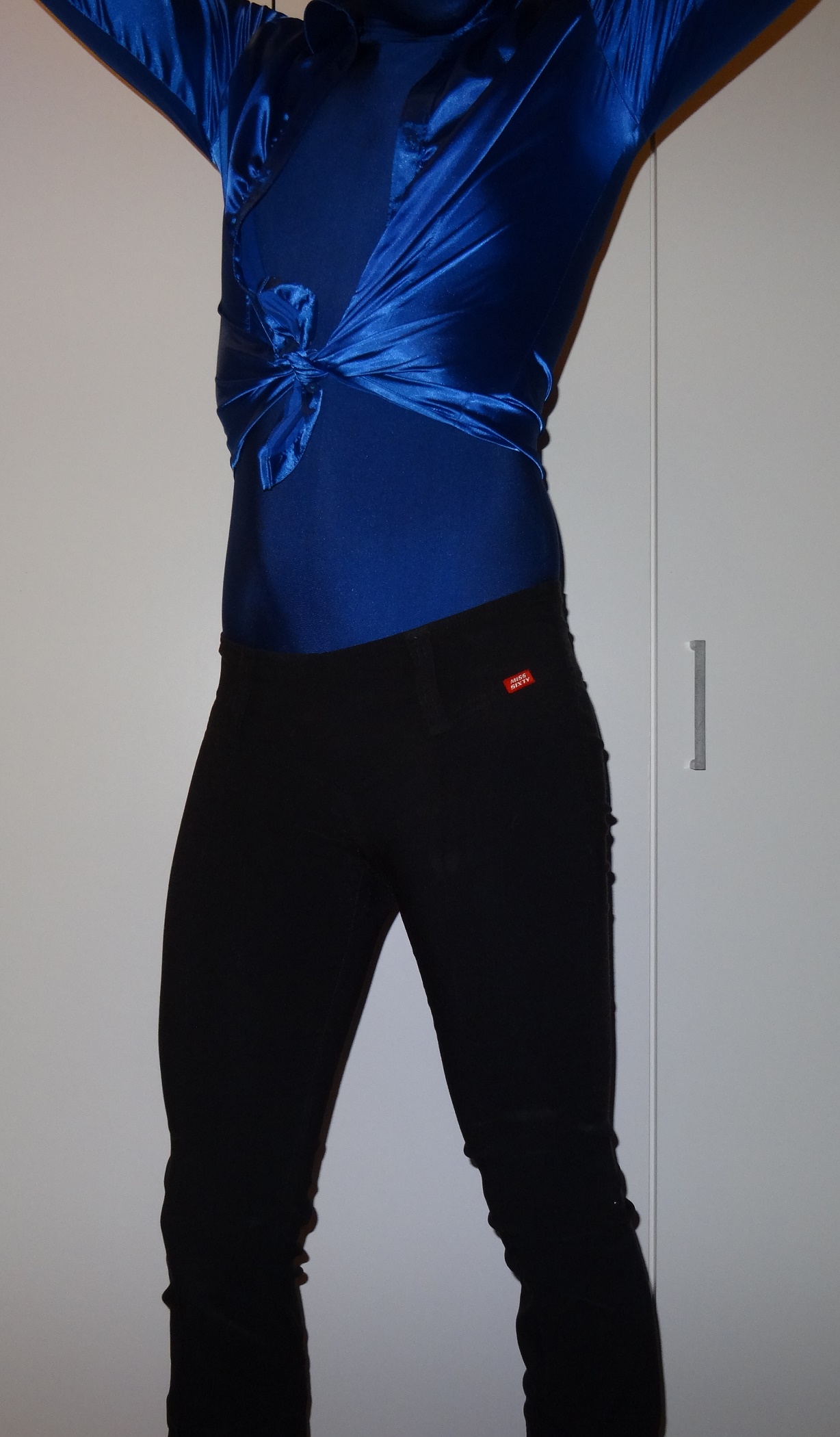 hier mein Outfit für heute eine hässliche Miss Sixty Flare Nixie Stoffhose und eine blaue Satinbluse