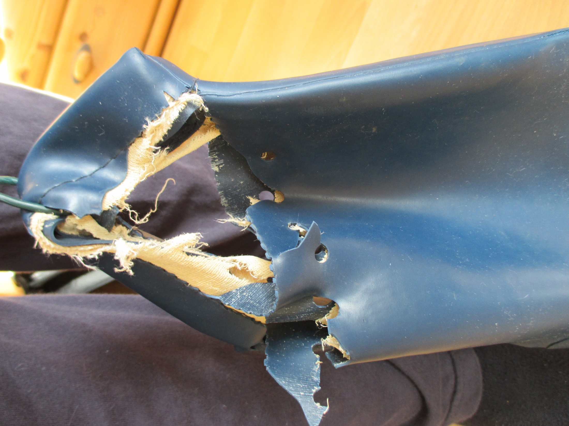 hier seht ihr, wie sich eine Schraube in den linken Gummistiefel gebohrt hat. Er war sowieso schon undicht wie man sieht. Ansonsten ist er aber noch ganz gut erhalten. Auf jeden Fall kann die Vernichtungorgie weitergehen.