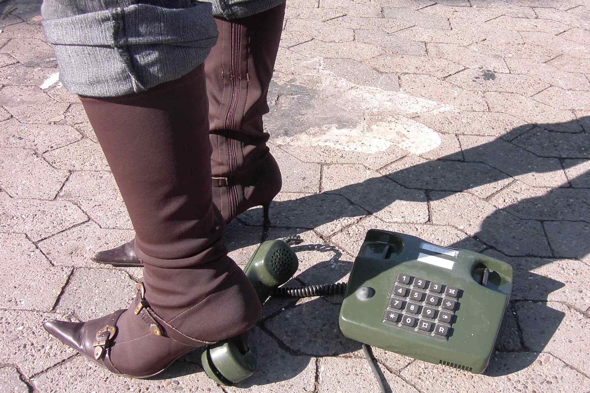 Auch wenn ich es eigentlich schade um den Apparat finde - die Hörerschnur hätte sicher noch als Ersatzteil getaugt (!) - finde ich es umso geiler, wie gnadenlos du die schicken Stiefel einsetzt.