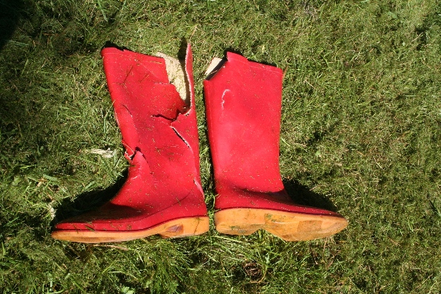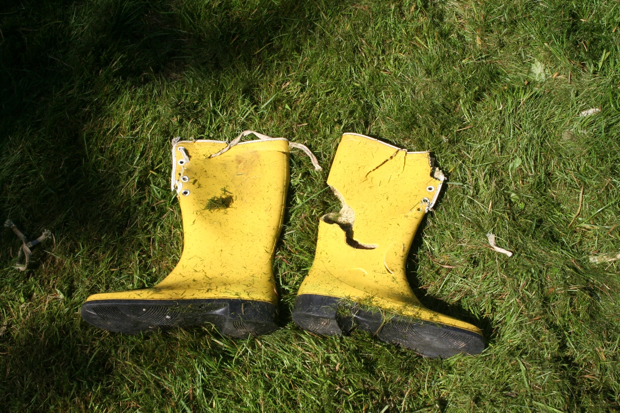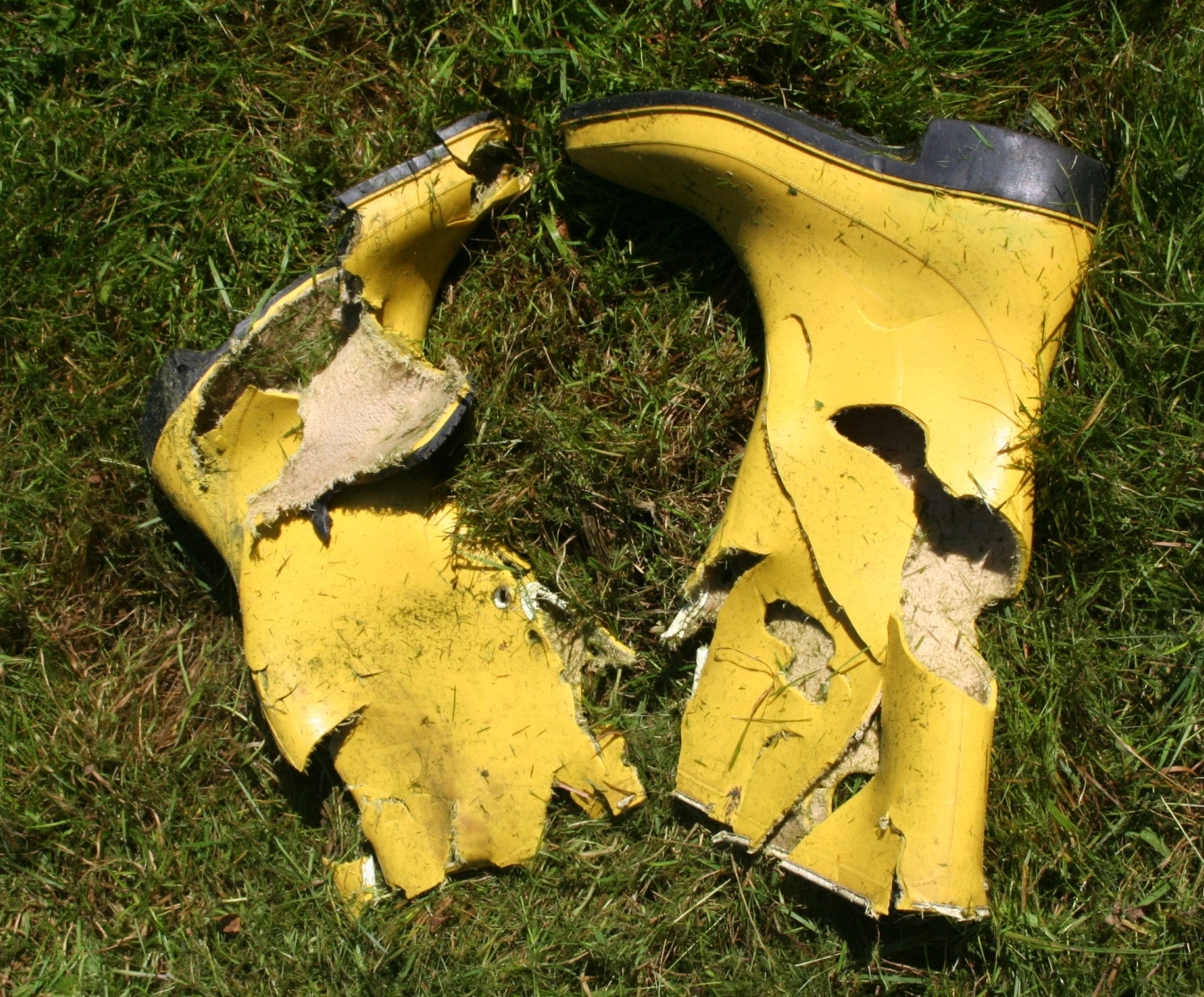 Mirjam hat mal Bilder von Gummistiefeln gezeigt, die unter den Aufsitzrasenmäher gekommen waren. Das hat mich angeregt, meinen Lieblingsgummistiefeln auch einmal eine solche Behandlung zukommen zu lassen.