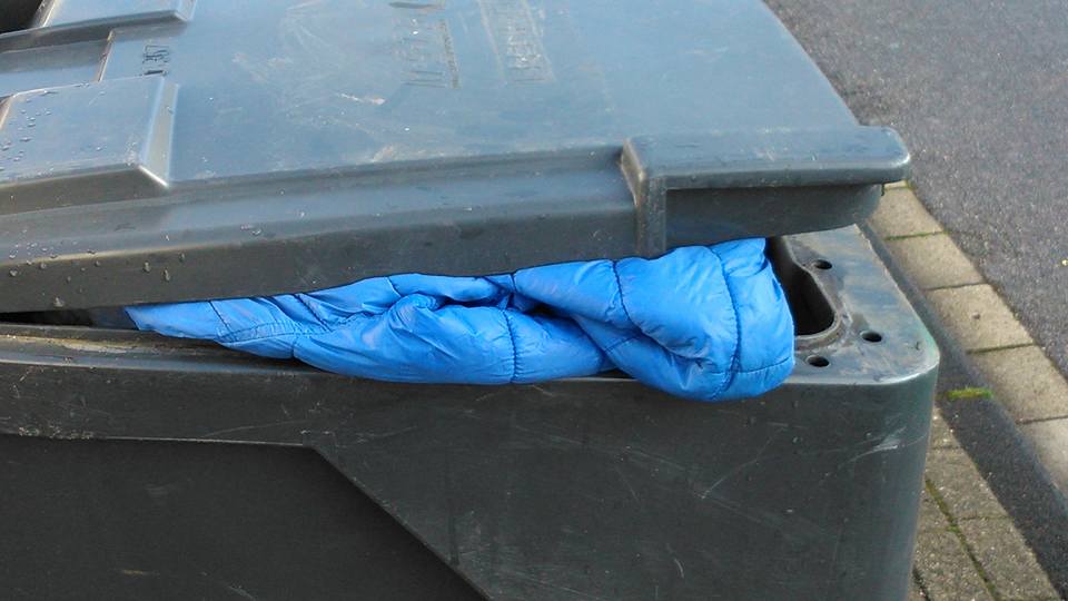 Fehlgeschlagene Entsorgung zweier Kinder Anoraks, den Rest hat der Hausmeister erledigt statt der Müllwagen